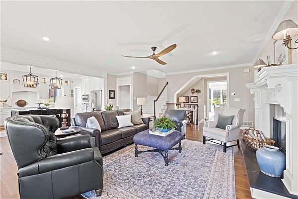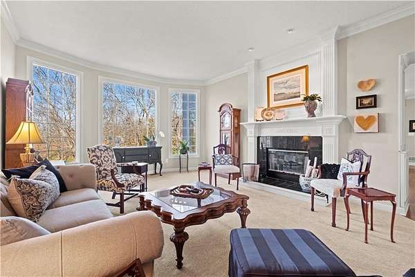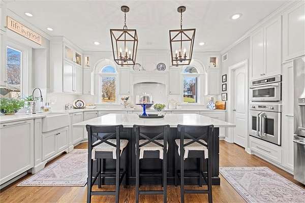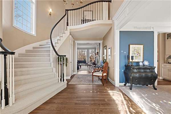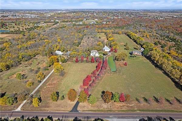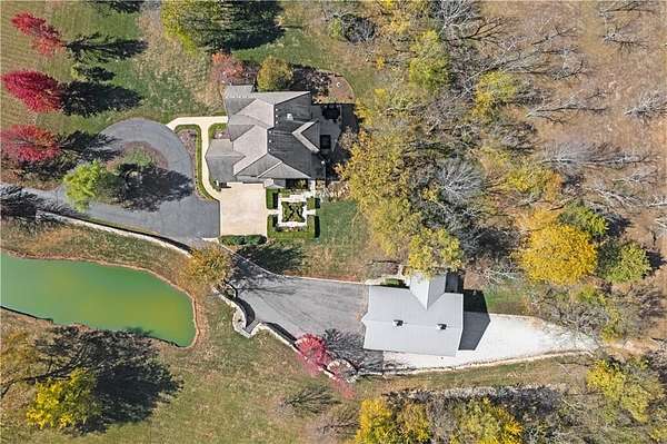 Welcome to this 10 acre estate in prime Overland Park location! Nestled at the end of a long private drive lined with vibrant October Glories, this timeless 4 bedroom, 4.5-bath home has been meticulously maintained and offers the perfect blend of luxury, charm, and privacy all just minutes from 69 highway. Set on 10 breathtaking acres backing up to 31 acres of wooded conservation land, this estate offers serene views, a pond, and endless possibilities for recreation or future development. The heart of the home is the open and bright main level featuring formal dining, formal living room, office, hearth room with see-through fireplace and a beautiful updated kitchen featuring top-of-the-line appliances, double ovens, induction cooktop, oversized island, and a spacious walk-in pantry. Upstairs, newly installed wood floors flow throughout the hallway and into the primary suite offering an expansive sitting area with fireplace, large primary bath and oversized walk in closet. Three additional bedrooms are upstairs, each with their own dedicated bathroom and walk in closet. The finished walk out lower level includes a second kitchen area, media room, home office, and additional living space. Outside, you'll find a beautifully maintained drive through barn that houses a fully updated kitchen complete with granite countertops, custom cabinetry, and a walk-in cooler room ideal for hobbies or catering needs. Store outdoor equipment, machinery, and cars in this expansive barn with separate shop and stairs leading to an upper level for additional storage space. Along with a list of updates, the exterior was freshly painted along with a new hot water heater installed last year. Just minutes from 69 Highway, and within the Blue Valley School District this rare home offers easy access to top-tier shopping, dining, and everyday conveniences. Whether you're seeking a private family estate or land with development potential, this property offers it all! Open House 3/14, 1:00-3:00pm