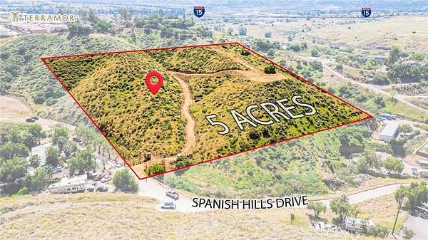 Perched atop a scenic hillside in the highly desirable Temescal Valley area of South Corona, this exceptional 5 acre parcel offers a rare blend of privacy, natural beauty, and prime location. Adjacent to the prestigious Terramor master planned community, home to approximately 1,450 residences, this property presents a unique opportunity to build your dream estate while benefiting from the growth and desirability of the surrounding area. This property is not subject to an HOA, giving you greater flexibility and freedom to design and use the land to suit your vision.