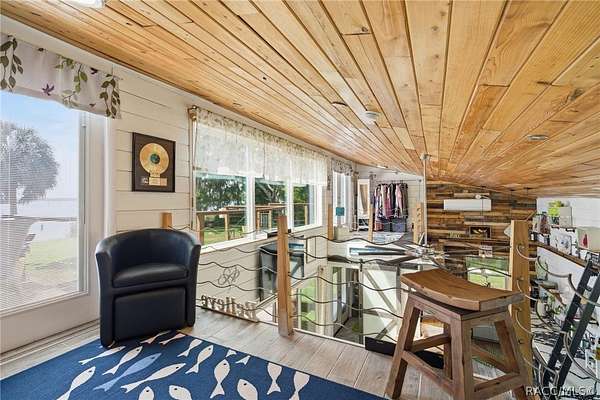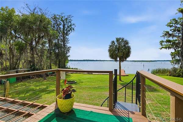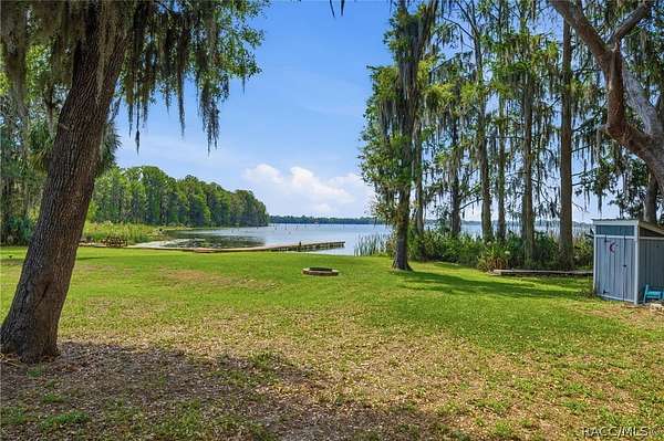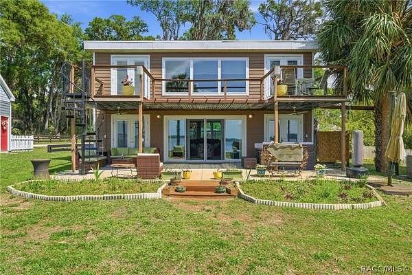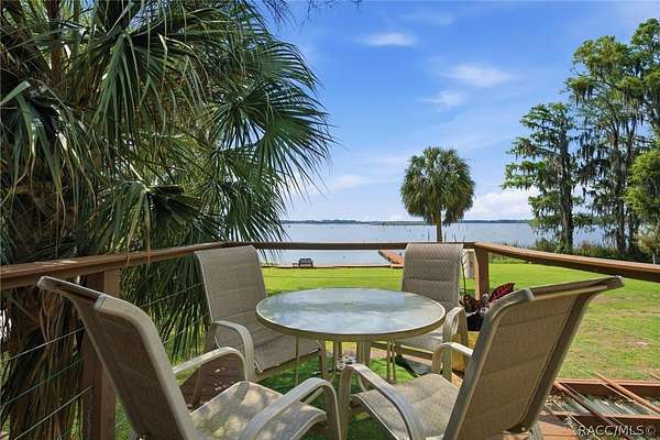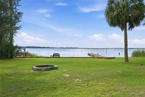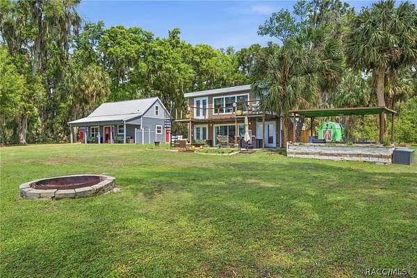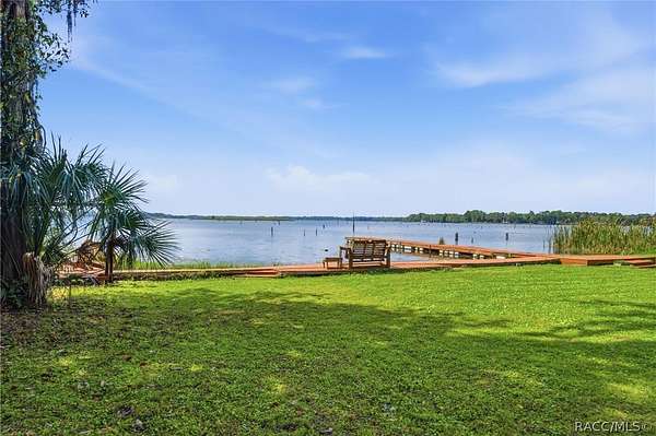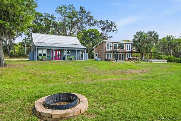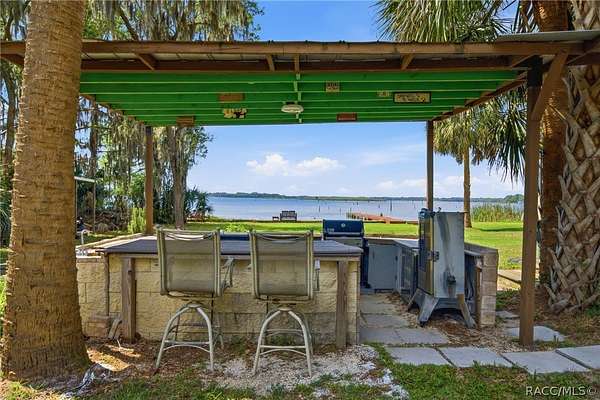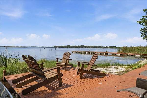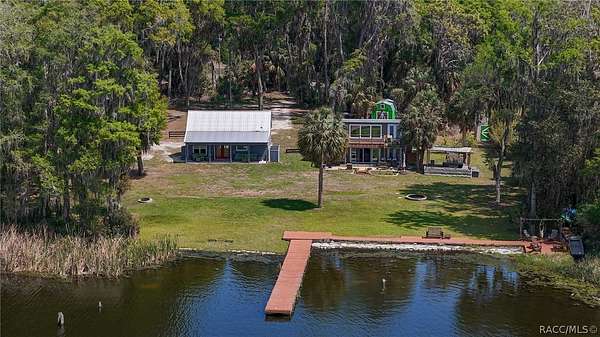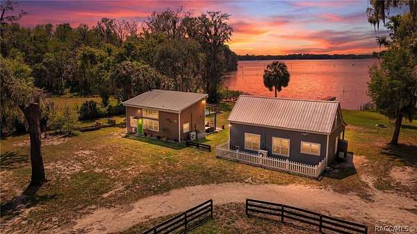 Just in time for summer! A family compound with so many options for fun! This property consists of two homes on 2 lakefront acres! Enjoy endless lake views with gorgeous sunsets from the dock, back porch or from either of the two balconies! Each home consists of one downstairs bedroom and full bath and two loft-style bedrooms where you can decide their purpose! Beautiful kitchen finishes include granite counters in one and quartz counters in the other. You will find Stainless Steel appliances in both kitchens and laundry areas. Very European vibe with the single wash/dry machine in kitchen of one home along with a single drawer dishwasher. The other is more contemporary with stacked washer/dryer. Rustic light fixtures and plumbing really add to the cabinesque feeling that each home exudes. A 9-blade ceiling fan in one house moves air throughout the home, tile floors in both, electric fireplace in one and rolling rail ladder create a dramatic feature-rich interior with each home expressing their own personality. Each home does have an extra shower only area - with full sky view! The primary home also features an outdoor kitchen with built-in cooktop griddle, gas grill, smoker and refrigerator - all with a beautiful view of the surrounding lakeside. Closer to the docks you'll find two firepits. Ideal if you plan on using one home for a VRBO, each party can have their own fire! The waterfront has been cleaned up to create a wide-open view of Lake Rousseau. The property lines extend into the lake, and the water is not that deep along the dock where you can see the fish through the clear water. The Withlacoochee River channel markers will guide you to the Inglis Dam Recreation Area where they have boat ramps and docks for launching. You can either launch into the Lake or into the river from the other side of the dam which leads directly to the barge canal and out to the Gulf. This property is one of the most unique properties to hit the market on Lake Rousseau in some time, so don't delay, see it today!