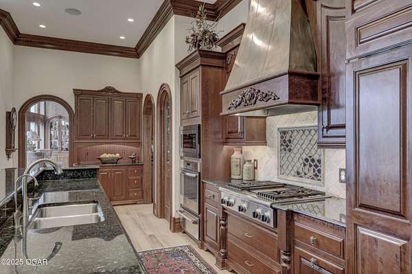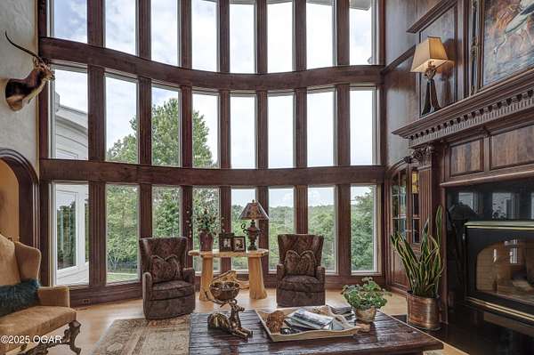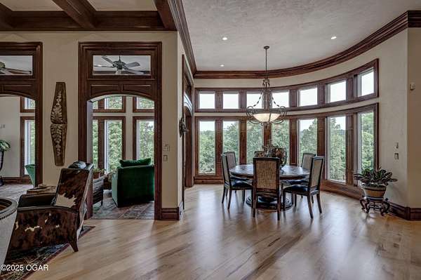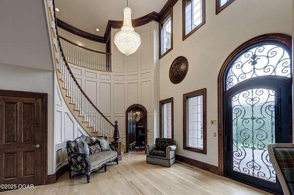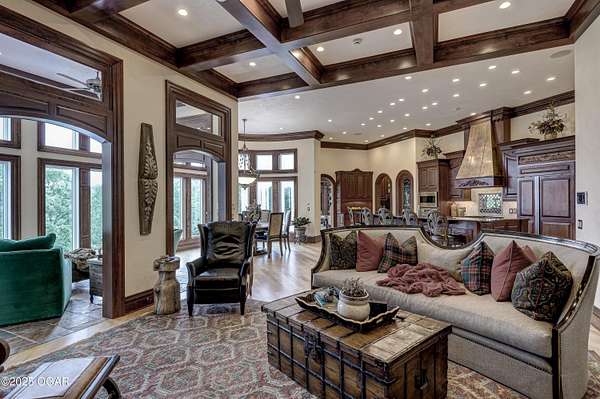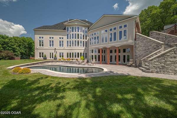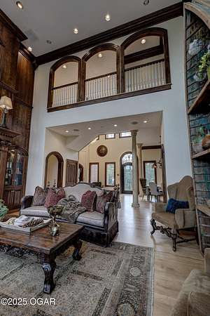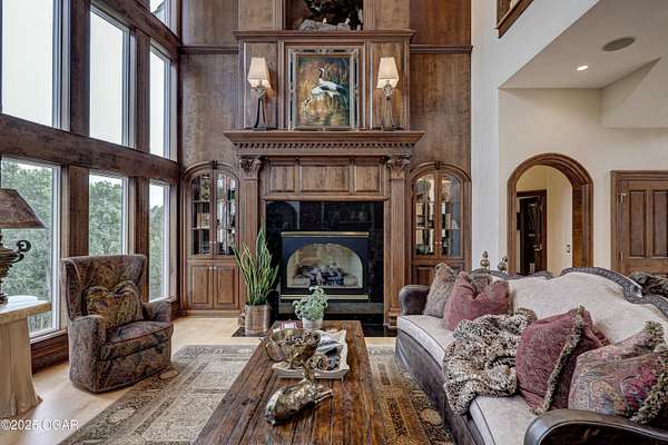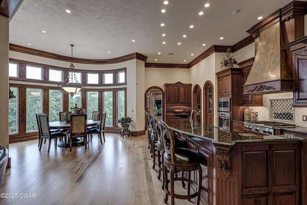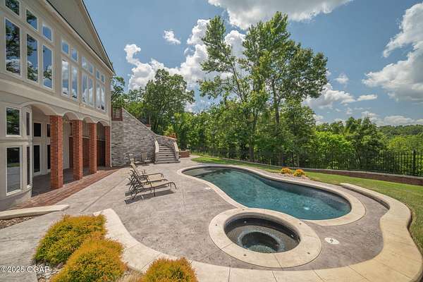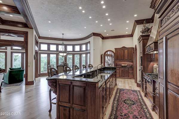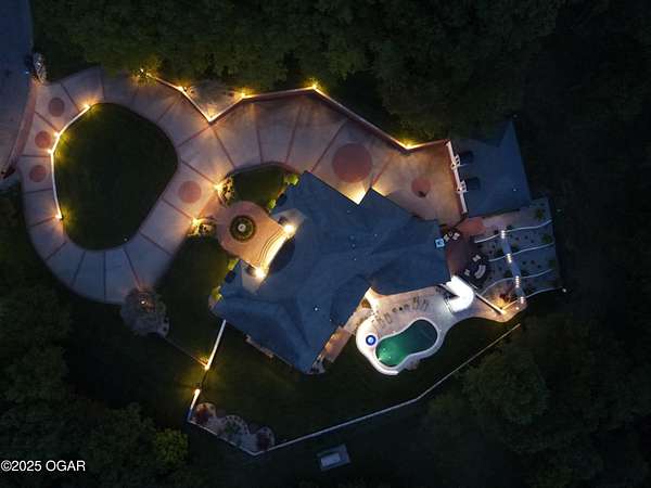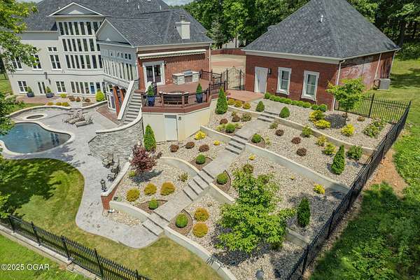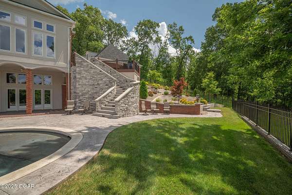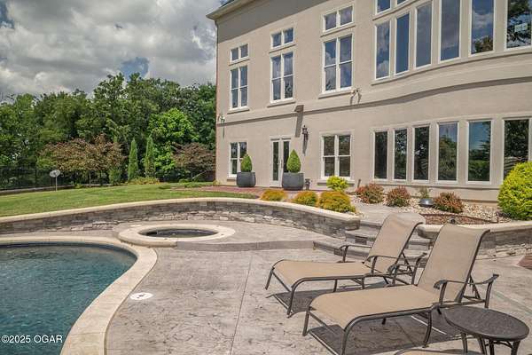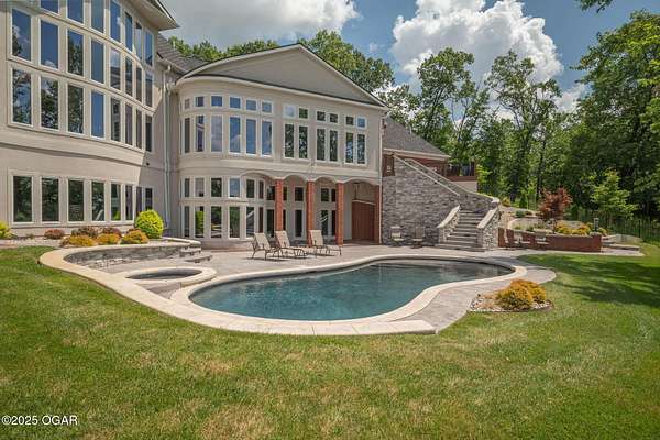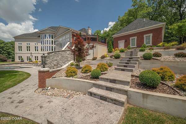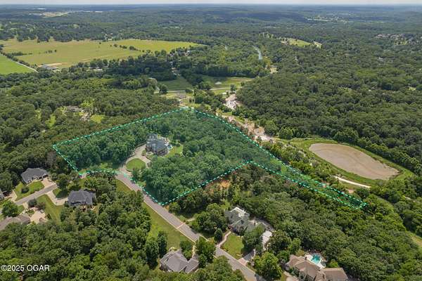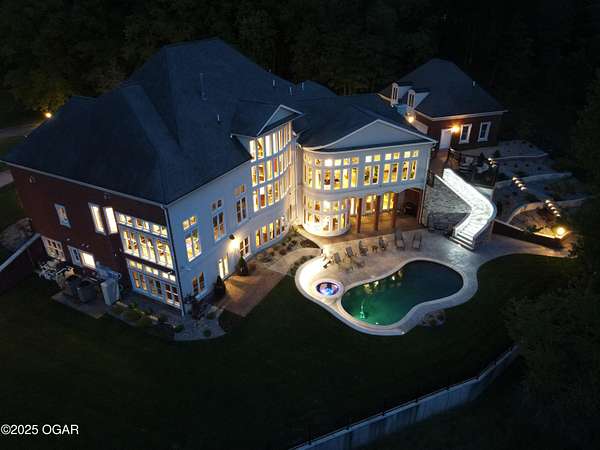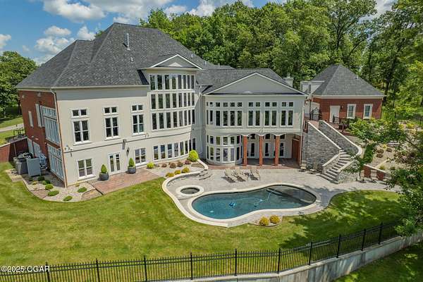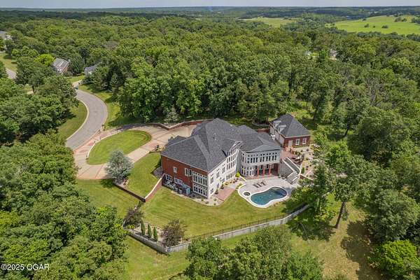 Amazing, quality built home sitting on 10 acres is a unique find in the luxury market. The 5 bedroom, 9 bathroom estate overlooks a beautiful private, wooded setting and features custom cabinetry and woodwork from Alpine Cabinetry throughout. No expense was spared in the details and quality of this home. The gourmet kitchen is perfect for everyday family gatherings and entertaining, and also great for the home chef featuring a 15 foot island, subzero appliances, thermador range, plenty of storage and a butlers pantry! Luxurious main level primary suite with floor to ceiling windows, amazing views, sitting area, and the closet of your dreams. The finished walkout basement is features tall ceilings, full kitchen including subzero appliances, 2 dishwashers, Wolf 36'' convection oven in the butlers pantry, and is the perfect place to relax or entertain guests. The backyard is a beautiful, private oasis with in ground pool, outdoor fireplace, beautiful landscaping and views that will make you feel your vacationing everyday. 5 gas fireplaces, Creston whole house automation system, house on city water and separate well for irrigation system saving hundreds of dollars per month. Minutes to both South Joplin hospitals, shopping, and restaurants. This immaculate home is the top of its class and completely move in ready. Schedule your private viewing today!