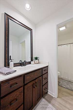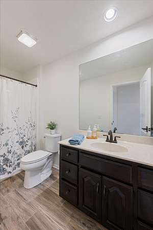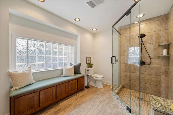 Retreat to the oversized primary suite, highlighted by a large walk-in tile shower and generous closet space. Two additional main-level bedrooms offer flexibility for family, guests, or a dedicated office. All bathrooms and the laundry area feature durable LVP flooring.