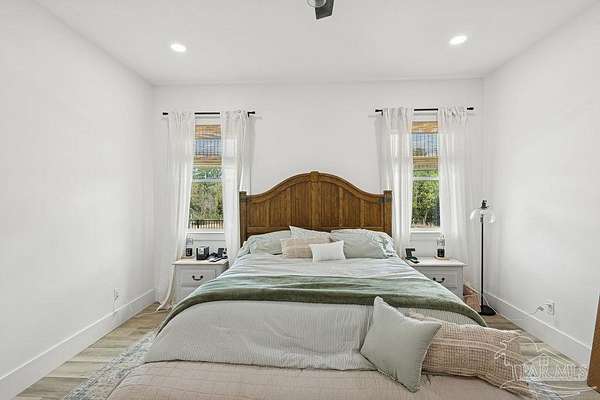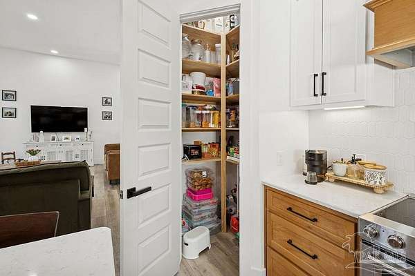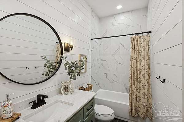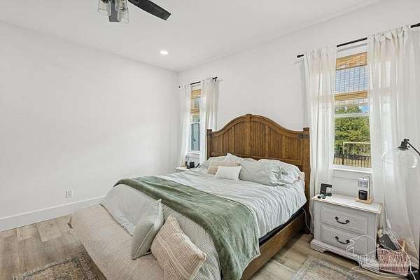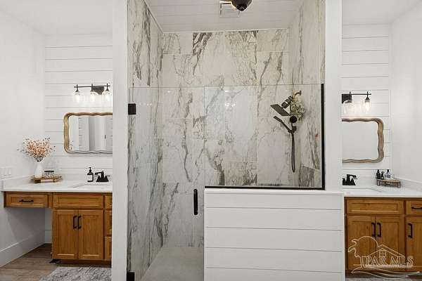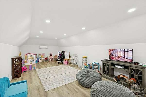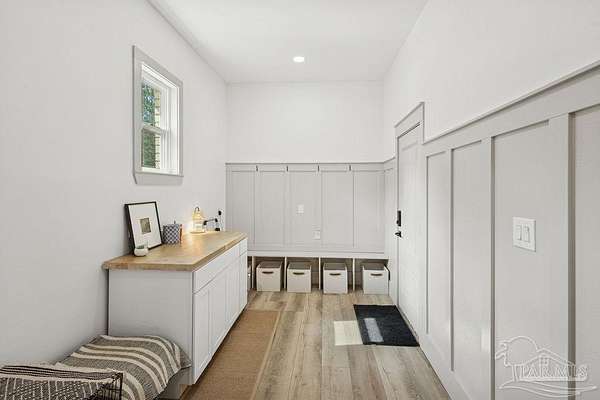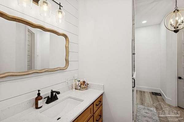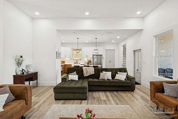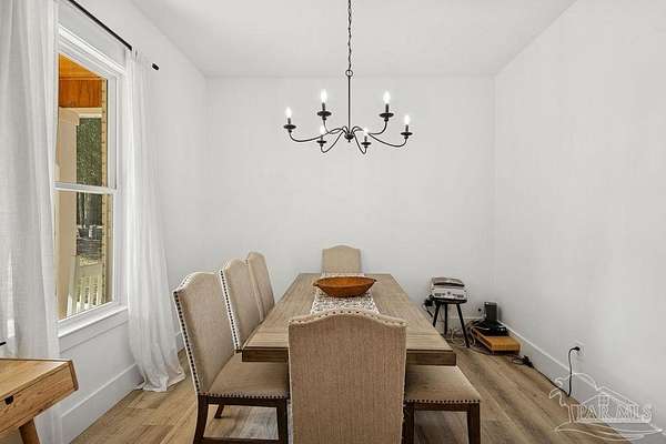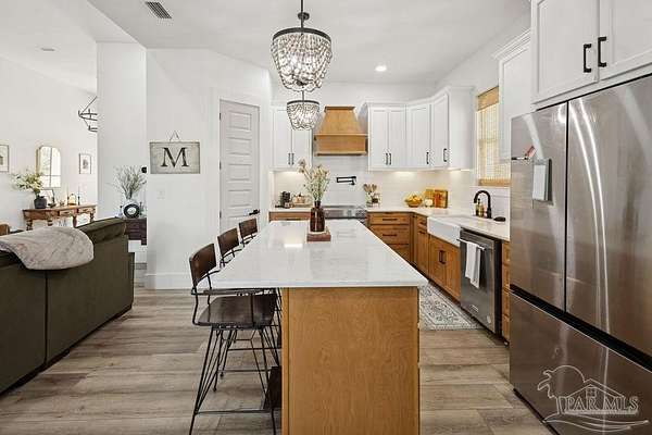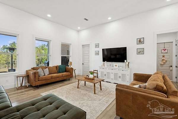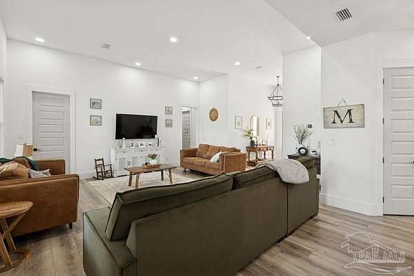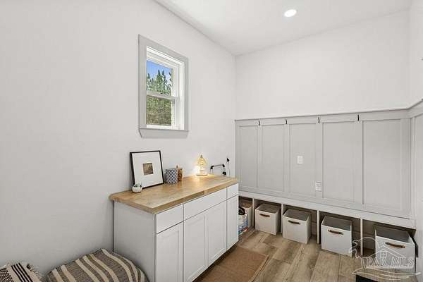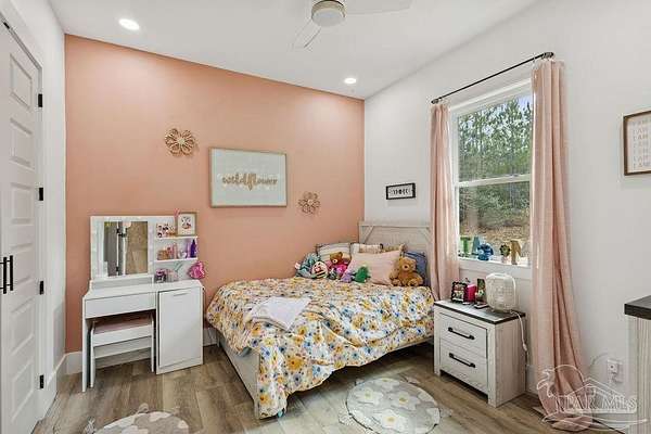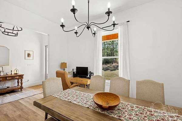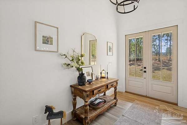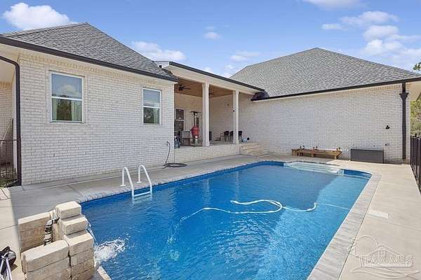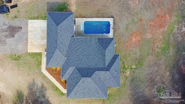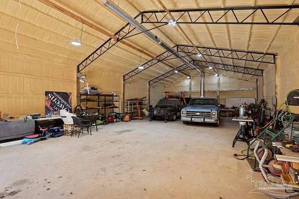 Custom-built in 2022 and situated on 8 private acres in Chumuckla, this 3-bedroom, 2-bath home offers 2,500 total heated and cooled square feet, including a spacious upstairs bonus room and a dedicated office or formal dining space off the foyer. Designed with both functionality and elevated finishes in mind, the home features 12' ceilings in the main living area and 8' doors throughout much of the home, creating an open and airy feel. Luxury vinyl plank flooring runs throughout, with tile in wet areas. The kitchen is appointed with quartz countertops, West Florida custom cabinetry, and detailed window and door trim work. Additional interior highlights include shiplap accents in the primary and hall bath, built-ins in the primary closet, a true mud room, expanded laundry area, tankless propane water heater, and a mini split system upstairs for added comfort and efficiency. The primary suite offers a spacious layout with a large walk-in shower and thoughtfully selected finishes. Outdoor amenities include a saltwater pool, large covered back porch with tongue-and-groove ceilings, outdoor shower, full gutter system, and an outdoor kitchen setup ideal for entertaining. Moore Creek runs along the rear property line, providing a natural buffer and enhancing the privacy of the setting. For additional storage or workspace, the property features a 60x30 heated and cooled spray-foam insulated shop, along with a 3-car garage. Both the home and shop are fully spray foam insulated for enhanced energy efficiency. Private setting, quality construction, and modern amenities - all on 8 acres in Chumuckla.