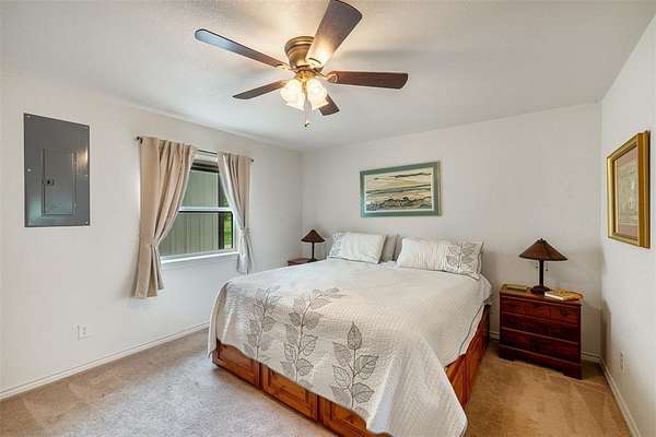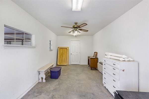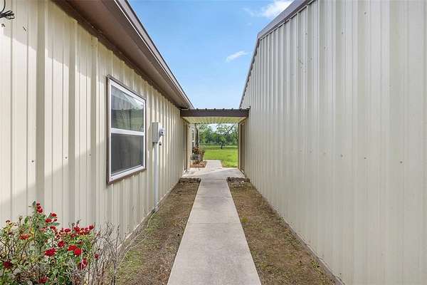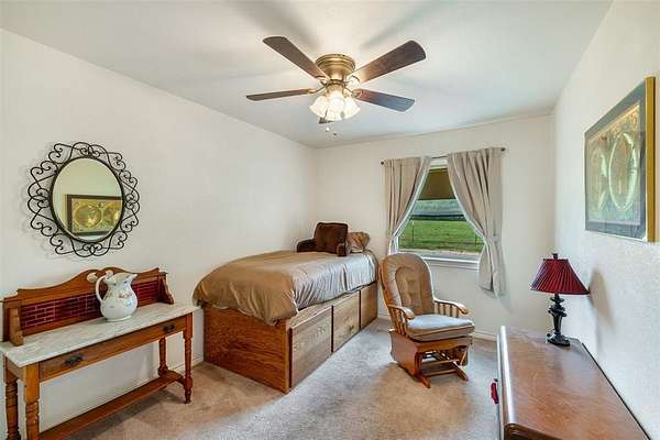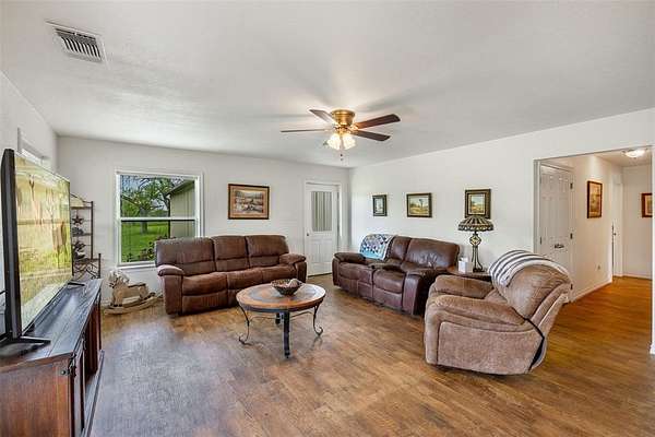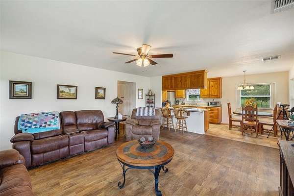 Aquilla Ranch features an approximately 1,200 sq ft, 2-bed, 1-bath Barndominium. The interior includes tile and hardwood floors with newer carpet in the bedrooms. The kitchen features custom cabinetry and an electric cooktop. A laundry room is adjoined to the kitchen and includes full washer and dryer hookups. An oversized garage for storing vehicles or equipment accompanies the main house. Additional living quarters are attached to the garage.
