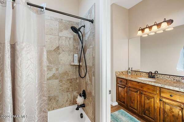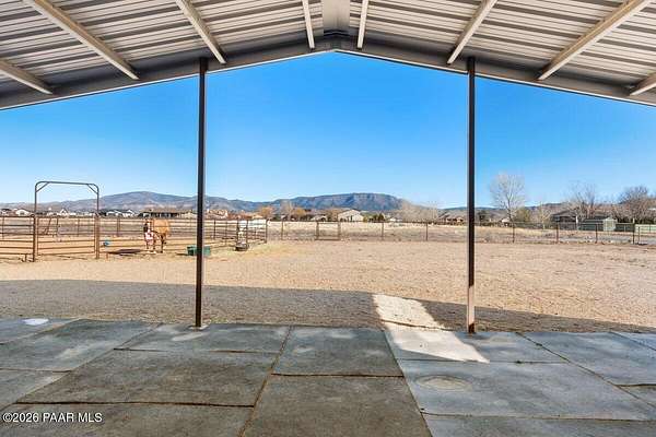 This is the perfect combination of a beautiful customer home AND the perfect horse property! The spacious interior and attention to detail are the first things you notice when you walk through the welcoming entryway. From the vaulted ceilings, the luxury vinyl flooring and into the living room with it's large stone fireplace. you will be in love with this home! As your gaze moves towards the back sliders the first thing you see is an amazing view of Mingus Mountain. To your right, the kitchen has two large granite counters that offer plenty of room for cooking a gourmet meal or a good old fashioned country feast after a long day of riding. The pantry is a generous size for storing plenty of staples and the refrigerator is newer and spacious as well. The eat-in kitchen is large enough for a full size dining table, or utilize the separate dining area off the entryway. There is no shortage of space to entertain in this home! Cozy up to the fire on a chilly winter evening or enjoy the large cover patio area, complete with hot tub. Or picture yourself roasting marshmallows over the outdoor firepit while enjoying the star filled skies. Indoors, the primary suite is the perfect place to wind down and relax. You can enjoy a nice hot shower or relaxing bubble bath in the beautiful bathroom that comes complete with double sinks and a separate vanity area. Plenty of room in the walk in closet for your fancy duds or boots and jeans. The guest rooms share a jack and jill bath and also have plenty of closet space. The first bedroom also has access to a side deck where you can enjoy the great outdoors while watching the horses frolic in the adjoining fenced area. On the opposite side of the home near the primary suite is a flex room that can be used as an office or guest room. The laundry room has the same beautiful cabinetry and granite counters as the kitchen, with plenty of storage and a utility sink. And if you still need more room wait until you see the 3 car garage with its easy maintenance epoxy flooring! This is also a detached 24 X 12' 1 car garage that can be used for storage or as a workshop as well. If that wasn't all you could imagine...wait until you see the horse amenities! The barn has 2 oversized 16' x 12' stalls, tack room & hay/feed room. along with a 12' x 36' covered area with open entry for the horses to enjoy in the warmer months. Additionally, they have a corral and round pen for exercising, or trot on down the road and enjoy riding across endless acres of state land. You may even see the wild horses that run through the mountains behind the subdivision! The property also includes mature fruit trees and a couple of pine trees for seasonal decorating. There is a separate portion of the two acres that is also fenced off for other animals or a dog run. Plenty of room to build a guest house...the possibilities are endless!