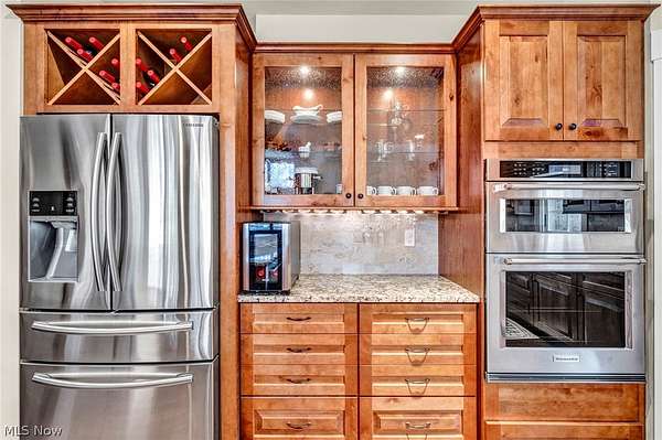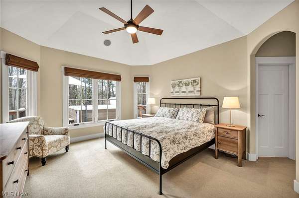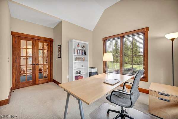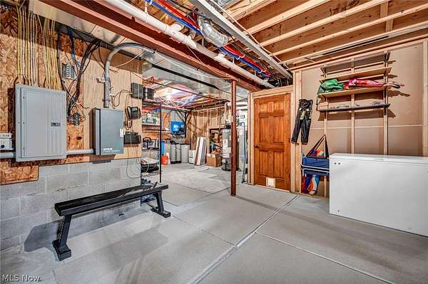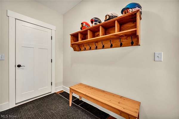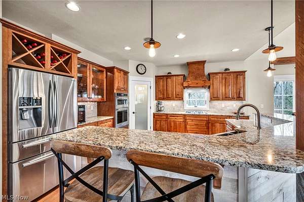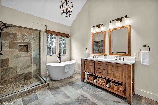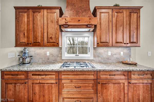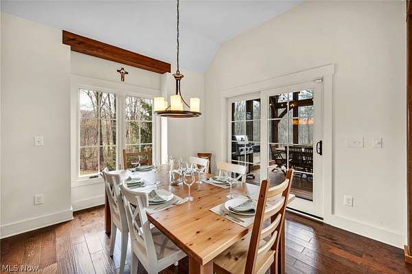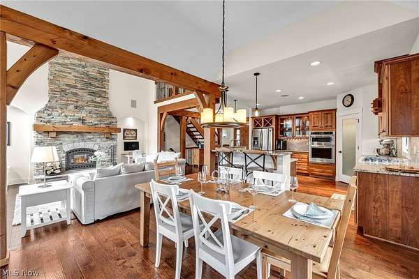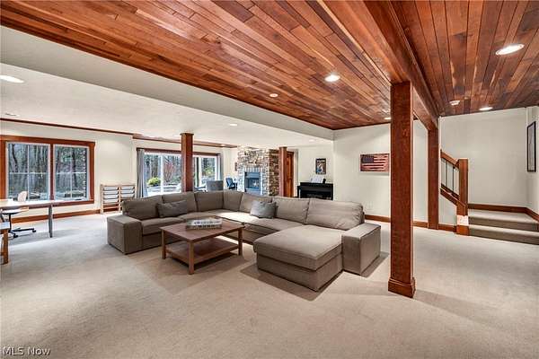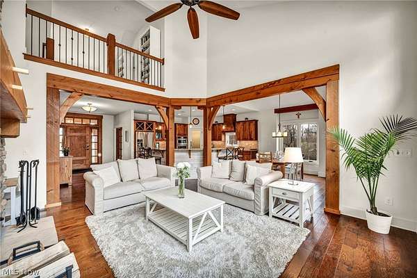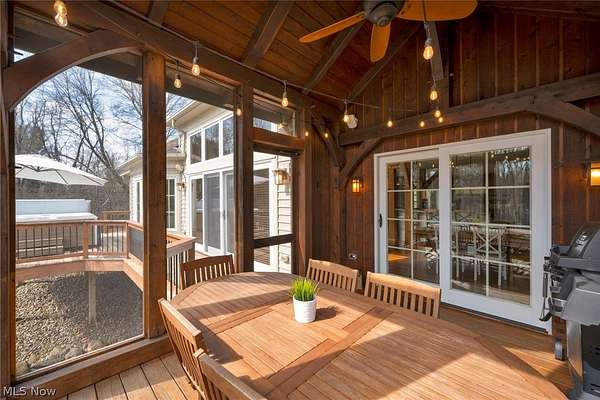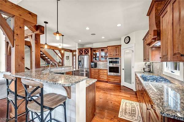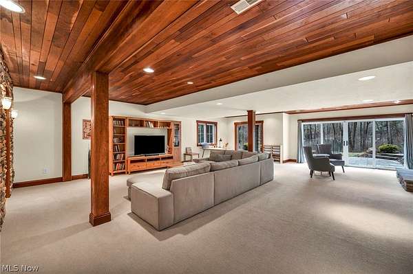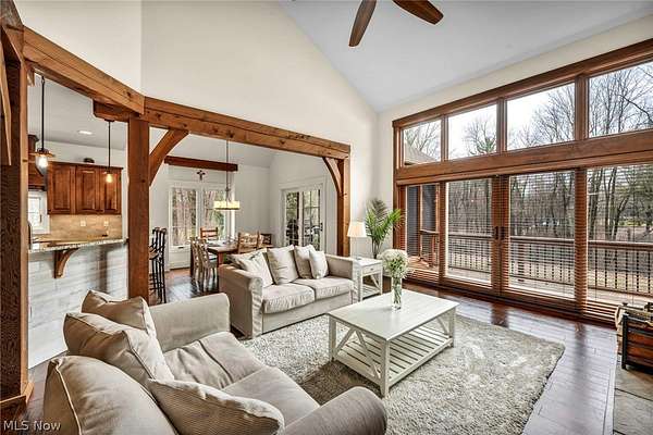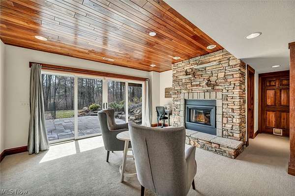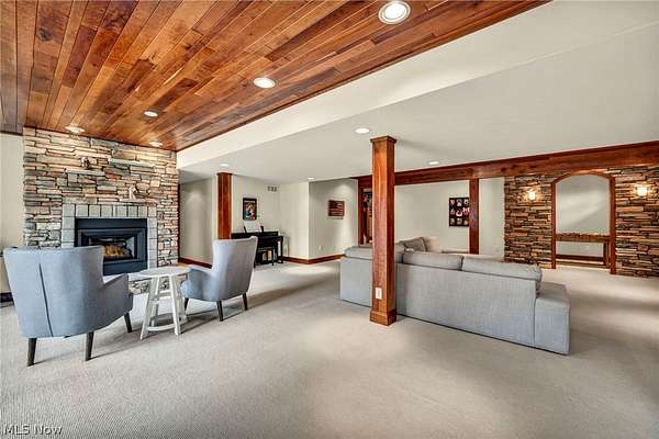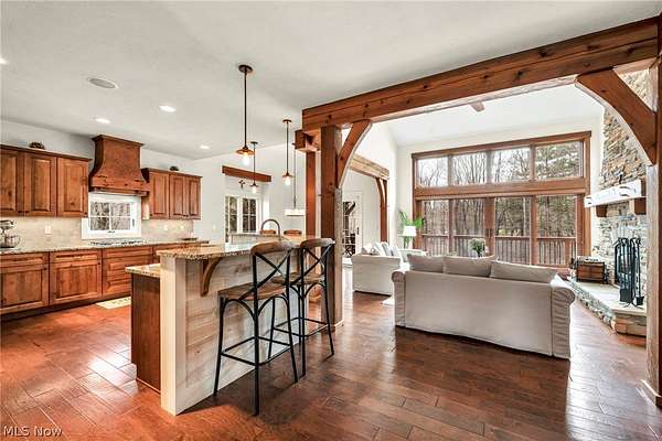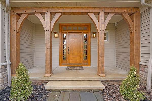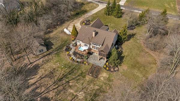 Custom-built Payne & Payne estate featuring unique Western Red Cedar post and beam timber frame construction on nearly 2.5 private acres, wooded on 3 sides with a private stream. This meticulously updated 4-bedroom, 4,139 SF home offers a main-floor master suite, home office, wood floors, and a south-facing rear with abundant natural light. The remodeled kitchen features a double oven, cooktop, new countertops, backsplash, and appliances. All four bathrooms have been fully renovated. Two fireplaces - wood-burning in the living room and gas in the finished walkout basement. Major upgrades include new furnace, A/C, water heater, well pump, Kinetico water softener, central vacuum, and a whole-house generator. Outdoor living features a timber-frame screened porch with gas grill hookup, Hot Springs hot tub, natural stone terrace and walkways, and an oversized workshop with wood stove. Heated 2-car garage. Minutes to Alpine Valley, Punderson State Park, Notre Dame Cathedral Latin, and Chardon Square.