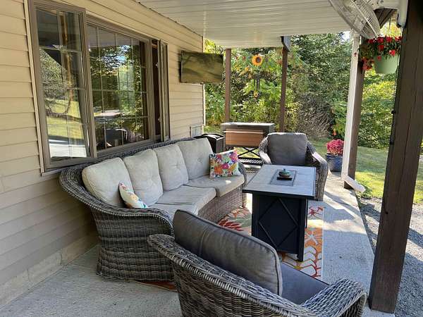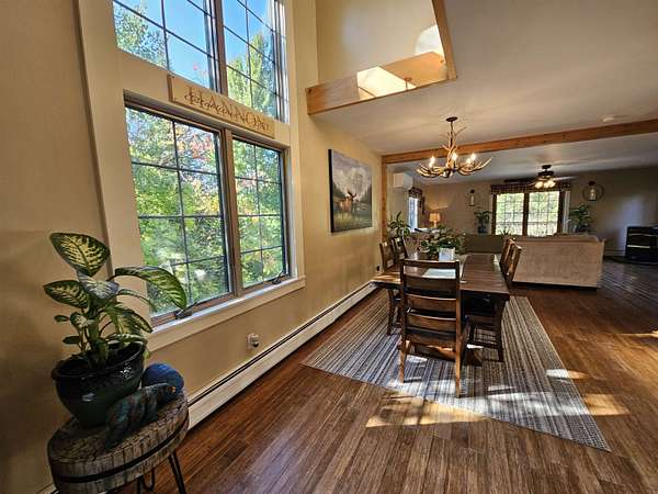 Conveniently located just minutes from Newport City yet offering exceptional privacy, this meticulously maintained 3-bedroom, 2-bath multi-level home is set on 1.6 beautifully landscaped and secluded acres. Nearly every aspect of the home has been thoughtfully updated, including a modern kitchen, refreshed bathrooms, new flooring, lighting, paint, and upgraded electrical. The finished lower level features a welcoming entry, a family room with a bar area and the first of three bedrooms, while the main level offers an open-concept layout with a modern kitchen, dining, spacious living room, and a half bath with laundry. Upstairs are two additional bedrooms, including an expansive primary suite and a second bedroom/office with access to a versatile loft space and full bath. Outdoor living is enhanced by a spacious wraparound deck accessible from multiple rooms, perfect for enjoying the peaceful, wooded setting. A dozen apple trees add charm and attract local wildlife. Additional features include a System 2000 oil boiler, two mini-split heat/AC units with room for a third, 200-amp electrical service, public water, conventional septic, and a new 12'x10' storage shed. Located just 5 minutes from downtown Newport amenities and 25 minutes to Jay Peak Resort, this move-in ready property offers privacy, tasteful updates, and incredible value--well worth a look. Seller is a licensed real estate agent.