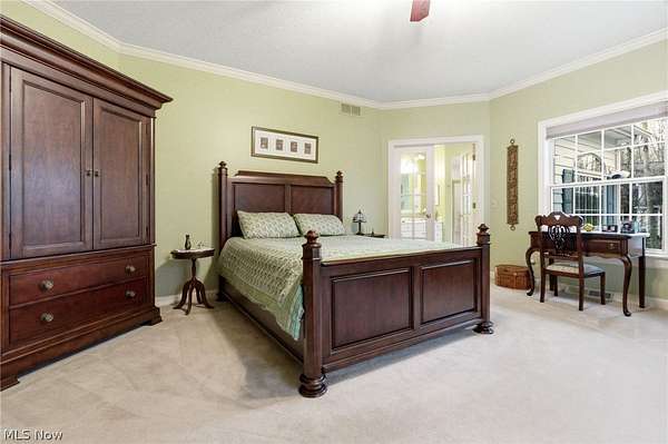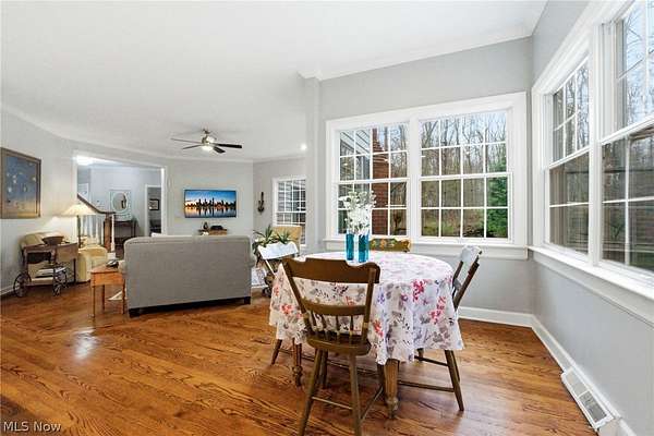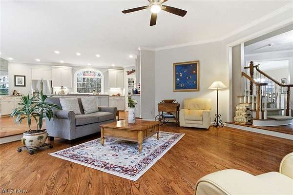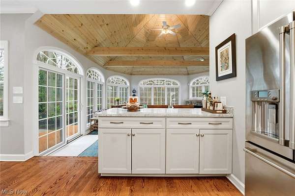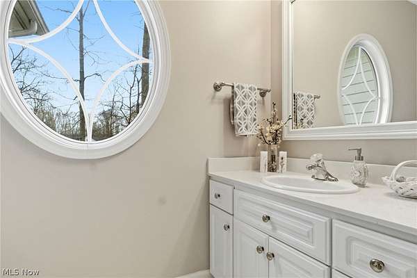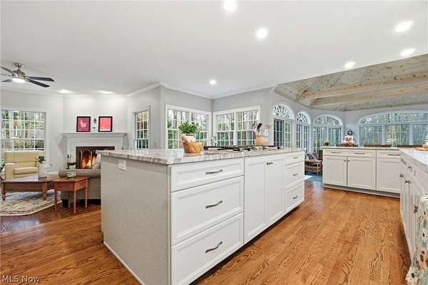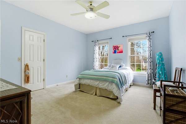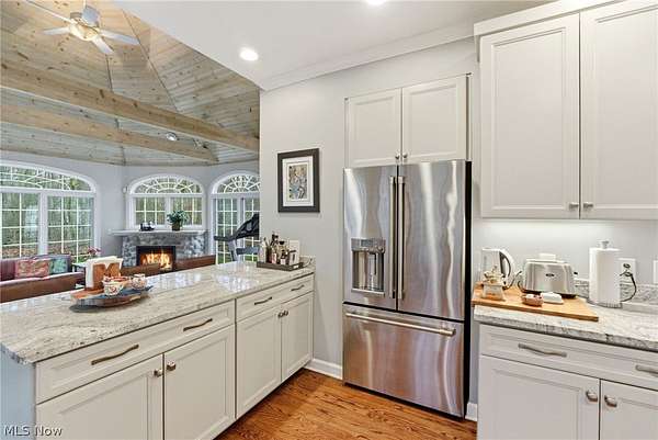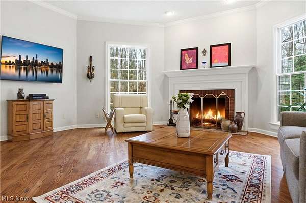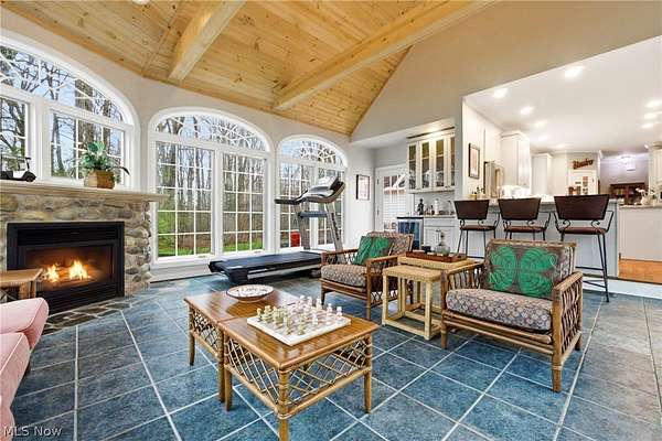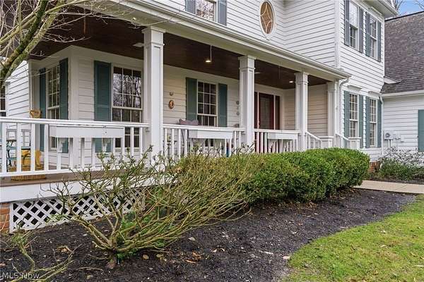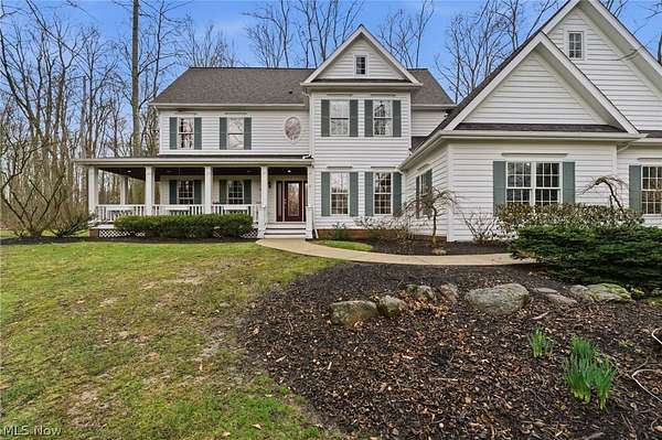 Spectacular and spacious colonial with stunning private 2.36 acre wooded setting awaits you on the quiet culdesac of Champion Lane. The charming wrap around front porch invites you into the open entry leading to a quiet living room and office both with privacy doors and continues into the open front facing formal dining room. Step into the spacious family room with hardwood floors and fireplace that opens to the gorgeous renovated gourmet kitchen (2019) with spacious island, granite counters, custom cabinetry, stainless GE monogram appliances and walk-in pantry. Continue into the vaulted grand sunroom with beamed ceiling & 2nd fireplace that walks out to the deck overlooking the private backyard setting. First floor is complete with hallway powder room and spacious updated laundry /mudroom (2019) with added work space that leads to 3+ car garage. Open staircase to the 2nd floor with beautiful primary suite facing the scenic backyard, walk-in closet, glamour bath with soaking tub & shower & toilet room (made private in 2016). Bedroom 2 with on-suite bathroom, bedroom 3 & 4 with updated jack-n-jill bath (2024) granite counter vanities, tiled tub & walk-in shower. Lower level includes large recreation room, tv room with 3rd fireplace, additional exercise room or extra office & plenty of storage. Many recent updates include new well filtration system (2024); house exterior painted (2024); updated jacknjill bathroom (2024); septic system pump replaced (2021); complete kitchen remodel (2019); laundry room updated (2019); hardwood flooring refinished 1st floor (2019) hardwood floors added to family room (2020); primary bath private toilet room (2016); pet wooden fence added in backyard (2016); new front door (2016); solar tube skylights (2016); sunroom sliding door replaced (2025) and much more listed in highlight sheet added in supplements. Superbly maintained home in desirable South Russell and excellent Chagrin Falls Schools. Ready to make your new home sweet home.