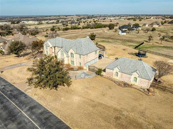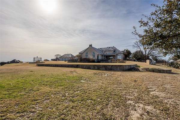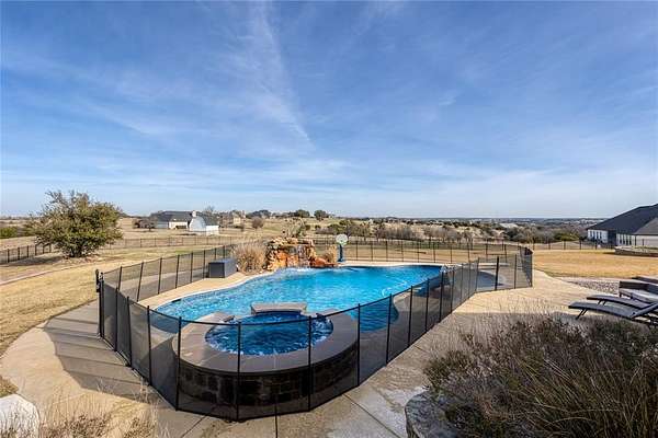 Situated on 2.13 acres inside the gated community of Canyon West Golf Club, this extraordinary estate blends refined luxury with sweeping Texas views. Designed for both grand-scale entertaining and everyday comfort, the home offers an impressive layout with expansive living spaces filled with natural light framed by vaulted wood-beamed ceilings, dramatic windows and a stunning floor-to-ceiling stone fireplace. The chef’s kitchen is a true showpiece, featuring Viking appliances, a twin Sub-Zero refrigerator and freezer, oversized island with prep sink, and rich stone finishes. The open design flows seamlessly into the main living areas, making it ideal for gatherings. The private primary retreat is a sanctuary of its own, complete with a fireplace, spa-inspired bath with dual vanities, freestanding soaking tub, dual-head walk-through shower, and an architectural stone feature wall that makes a bold statement. Specialty spaces elevate this home to the next level, including an expansive game room with wet bar, exercise room with mirrored walls and rubber flooring, safe storage room, and both upstairs and downstairs laundry rooms for ultimate convenience. A separate mother-in-law suite provides flexibility for guests or multi-generational living. Step outside to a resort-style backyard designed for unforgettable entertaining. The diving pool and spa feature a cascading waterfall, expansive decking, and multiple lounging areas — all positioned to capture the elevated views. An outdoor kitchen, pergola-covered patio, fire pit, and beautifully landscaped grounds complete the experience. The gated drive and detached 4 car garage add both function and presence to this estate-sized property. Located within Canyon West, residents enjoy a golf course setting while remaining just minutes from Weatherford with convenient access to Fort Worth. This is more than a home, offering space, sophistication, and lifestyle in one of Parker County’s most desirable gated communities.