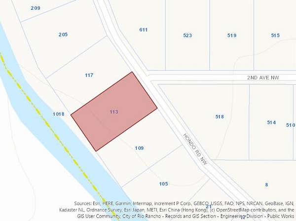 From Southern Blvd SW and Rainbow Blvd SE go north on Rainbow to 2nd Ave NW, about 1.4 miles. Then left or west on 2nd about 6/10ths mile to T, which is Hondo Rd NW. Lots to the west and NW of the T. 113 Hondo Rd (U8 B42 L35) South lot Lat/Long: 35.260829, -106.749503; 117 Hondo Rd (U8 B42 L34) North lot Lat/Long: 35.261198, -106.749830