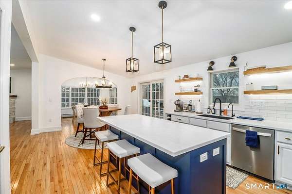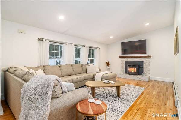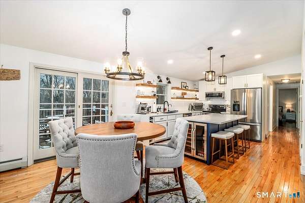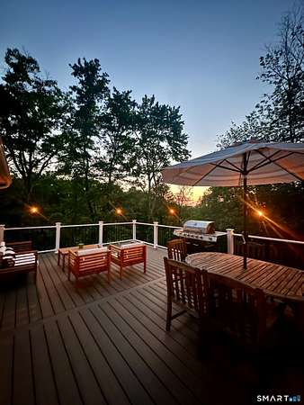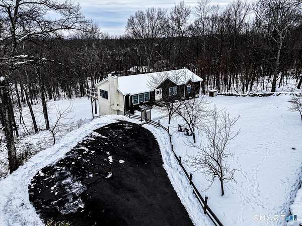 Discover serene luxury and refined comfort in this beautifully updated 3 bed, 3 bath home set on over 2 private acres in the King Street area. With 3,100 gross sq ft (including partially finished lower level) and vaulted ceilings, skylights, and walls of windows, this extended ranch home is filled with natural light and captures stunning sunset views year round as it's situated at one of the highest points on King Street. Step inside to a thoughtfully renovated interior featuring gleaming hardwood floors, a brand new kitchen, and an inviting open layout perfect for everyday living and entertaining. The kitchen boasts a large island, built-in wine and beverage fridge, modern shaker cabinetry, and seamless flow into the dining room, also a bright sunroom wrapped in windows and skylights, complete with extra-tall custom built cabinets and butcher block shelving for beautiful storage and display. Relax in the spacious living room with vaulted ceilings and enjoy ultimate comfort with two options: a new pellet stove complemented by a new boiler and water heater for reliability and efficiency. Retreat outdoors to the oversized trex deck, newly built and perfectly positioned to overlook your private acreage and sweeping views. The property is a nature lover's paradise, featuring apple and pear trees, garden area, rock walls, fencing for pets, and a sense of seclusion rarely found, yet just 10 minutes to shopping, highways and Candlewood Lake. A rare opportunity at this price point!