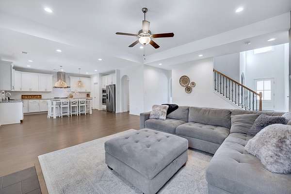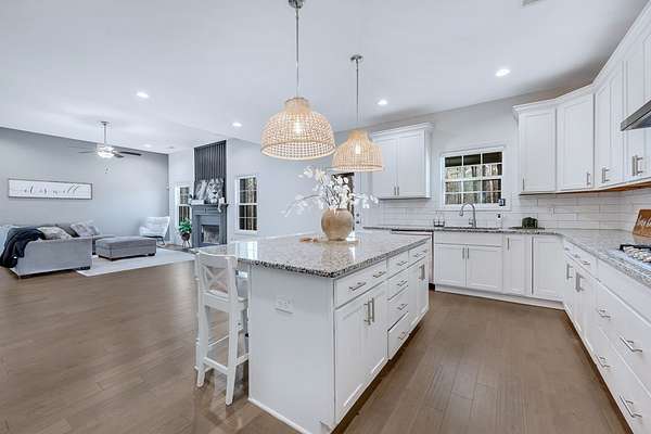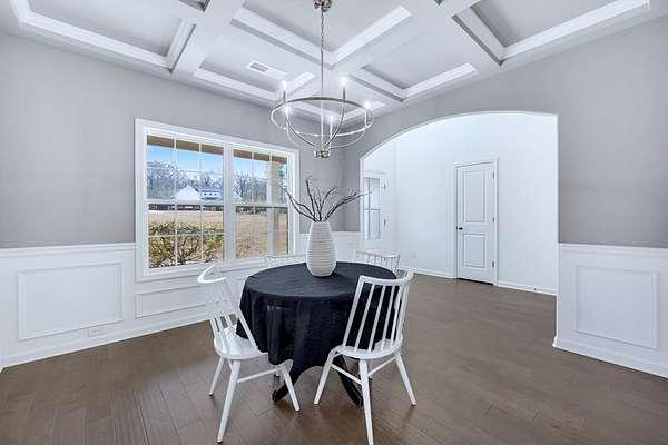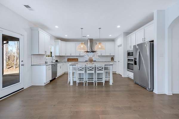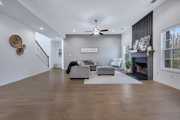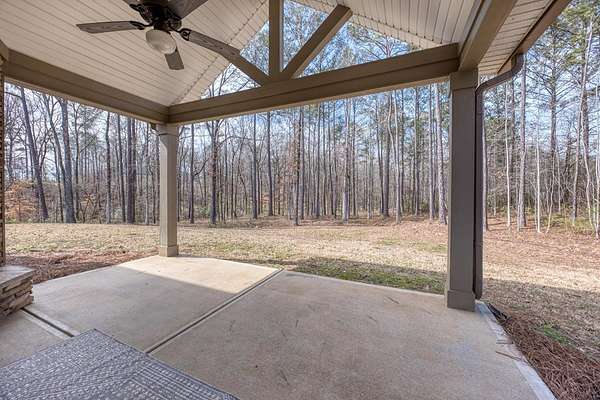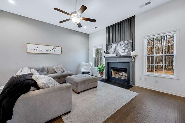 Craftsman-style, energy-efficient home situated on 2.33 acres. Flowing engineered hardwood floors grace the living and dining areas, beginning with a welcoming two-story foyer. An arched entry leads into the formal dining room filled with natural light, featuring a coffered ceiling and judge's paneling. The family room, complete with a fireplace, opens to the gourmet kitchen offering a large island with seating and ample workspace, gas cooktop, vent hood, wall oven and microwave, and a walk-in pantry. The mudroom provides access to the laundry room and the two-car garage. The primary suite is located on the main level and features a specialty ceiling and a private bath with dual vanities, a soaking tub, a walk-in tiled shower with seat, and a large split walk-in closet. A convenient half bath is also located on the main level for guests. Upstairs, you'll find three spacious bedrooms, a large media room, and two full bathrooms. Enjoy outdoor living on the extended front porch with wrap-around detail on the left side, or relax on the covered game-day back porch featuring a fireplace, TV outlet, built-in speakers, and an exterior gas line for grilling. Conveniently located with quick access to I-185.