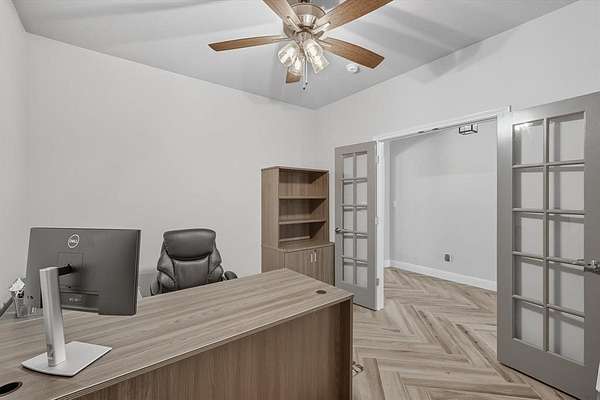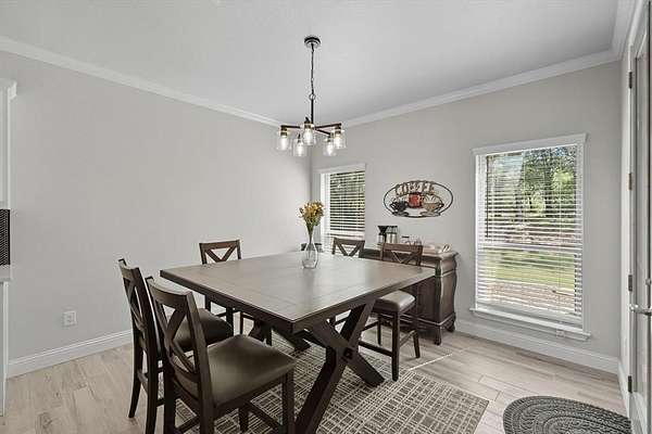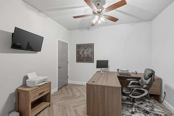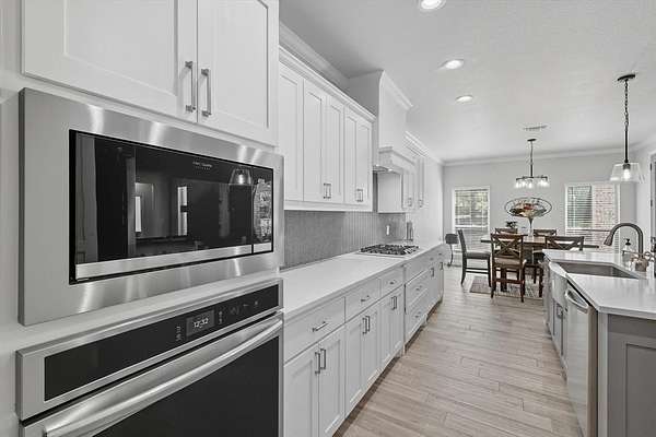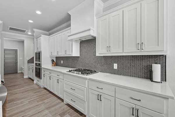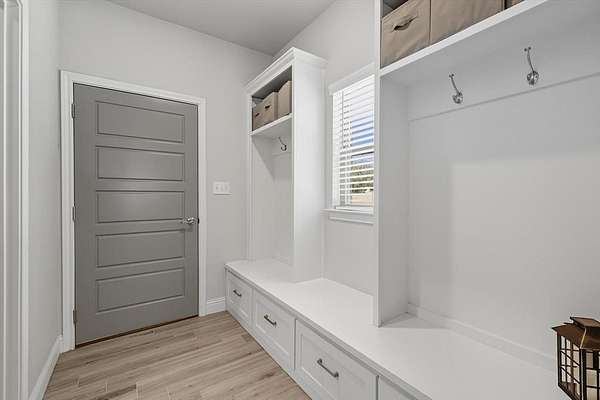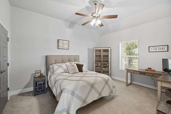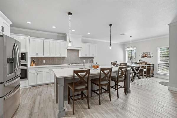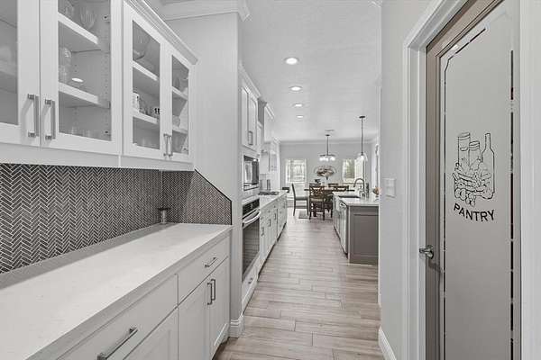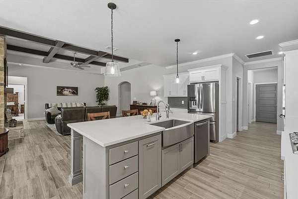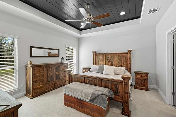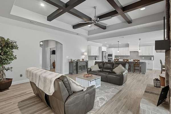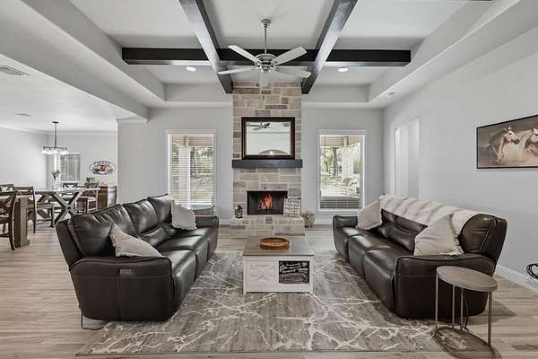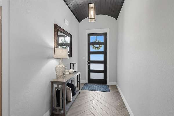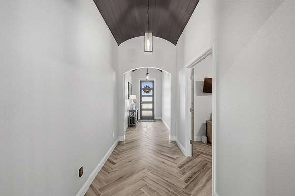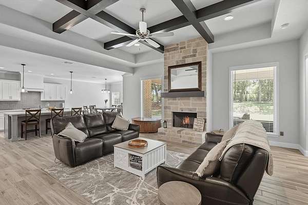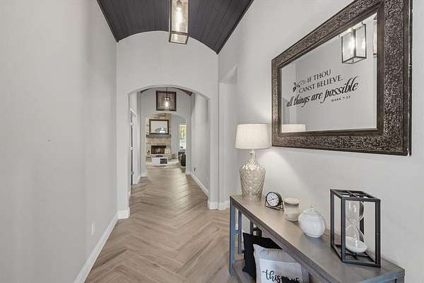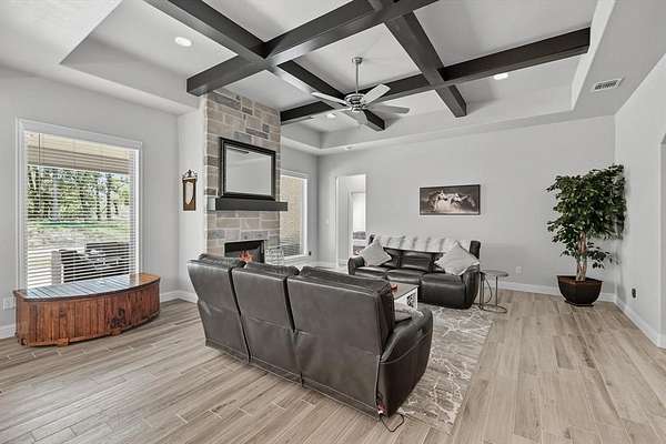 Inside, you are greeted with stunning wood barrel ceilings that add a unique touch. To the right, you will find three bedrooms and two full bathrooms. An office is tucked down the hall to the left with no windows, making it an excellent flex space or theater room. The living room showcases coffered ceilings that complement the barrel ceiling design, tying the home together beautifully. The kitchen is equipped with an oversized island, a butler's pantry, and direct access to the mudroom with a full tree hall to keep coats, bags, and purses organized. The master suite features tray ceilings accented with shiplap, a spacious ensuite with separate shower and soaking tub, and an oversized walk in closet. This home offers an abundance of storage and thoughtful details throughout.