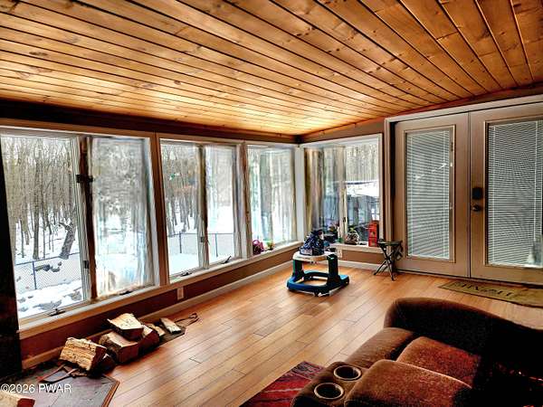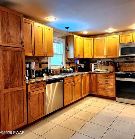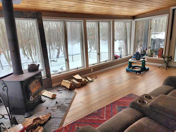 Imagine sitting by the wood stove in the warm and cozy sunroom watching snow fall outside this 4 bedroom 3 full bath home located on a cul-de-sac with community green space behind. In the warmer weather relax on the deck and enjoy all the sounds of nature surrounding you. On the first floor there is a livingroom, dining room, updated eat in kitchen, sunroom and full bath. Upstairs find the primary bedroom with a private full bath, three more bedrooms and one more full bath. The basement has lots of space for storage, the washer and dryer plus another wood stove which current owners have not used since the one on first floor keeps the whole house heated. The property has a fenced in area a dog or two would really enjoy, a fenced in garden, a circle driveway and is located on two oversized lots that total 1.76 acres in Fawn Lake Forest homeowners association. Community amenities include clubhouse, fitness center, indoor pool, outdoor pool, lake and beach house. Minutes to skiing, the Delaware and Lackawaxen Rivers with a short drive to downtown Hawley and Lake Wallenpaupack. This home offers so much that will make a full time or vacation homeowner very comfortable. See you in The Poconos!