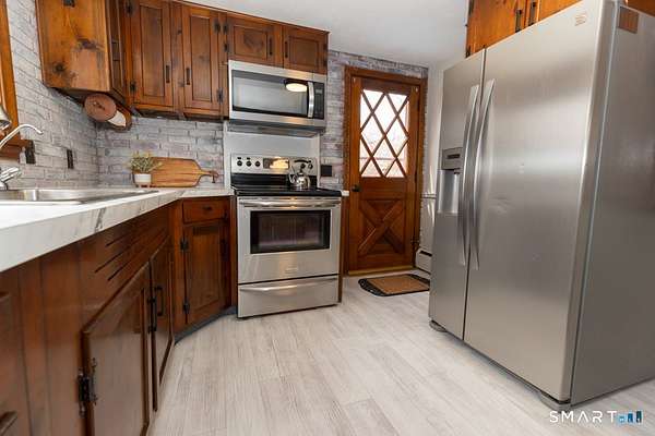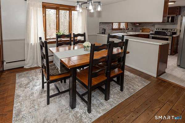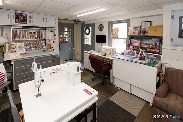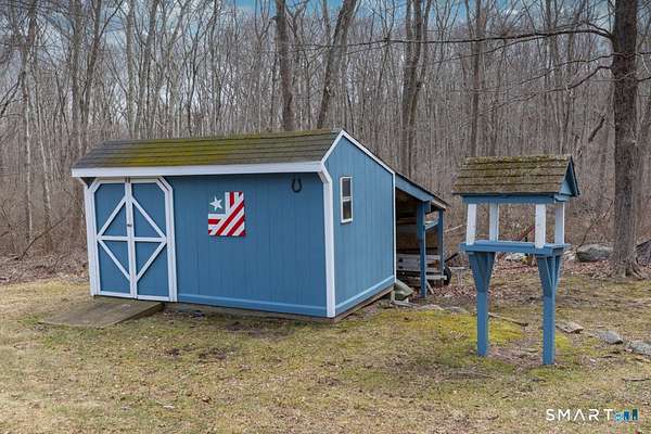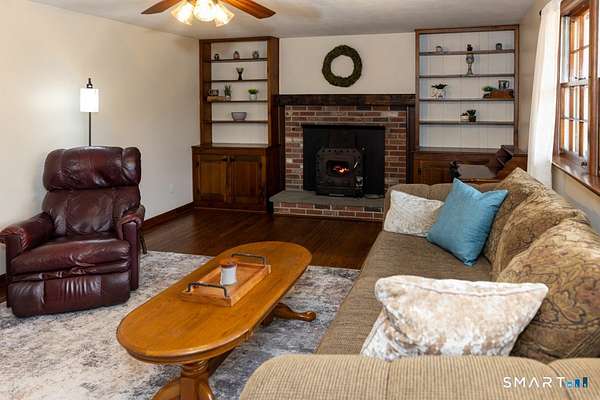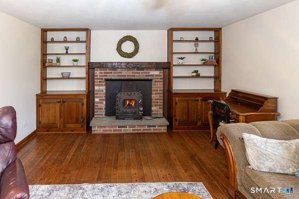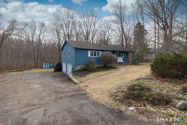 Enjoy easy one-floor living in this well maintained 3 bedroom ranch, conveniently located near town, schools, and Lake Pocotopaug. The home features a spacious living room with a cozy wood burning fireplace, perfect for relaxing or entertaining, along with pegged plank wood floors and solid wood doors throughout, adding warmth and character. The primary bedroom includes both a standard closet and a cedar walk-in closet for added storage. Custom-built cabinets, crafted by an expert East Hampton builder. The finished basement offers additional living space, including a 14x16 hobby room, half bath and laundry area. A ventilation fan efficiently pulls warm air out of the house to help keep the home cool during the summer months. An oversized two-car garage with a dedicated workshop area provides plenty of room for storage and projects. Situated on over 2 acres, the property offers endless possibilities-ideal for gardening or future expansion. The outdoor space features a fenced in side yard, a fire pit, and a stone patio set above a stone wall, complete with a swing, picnic table, and benches. The front porch bench is also included, creating the perfect setting to relax and enjoy the surroundings.