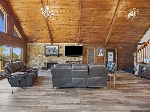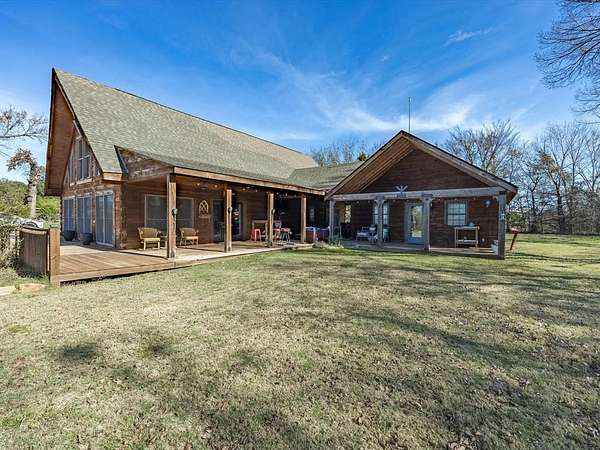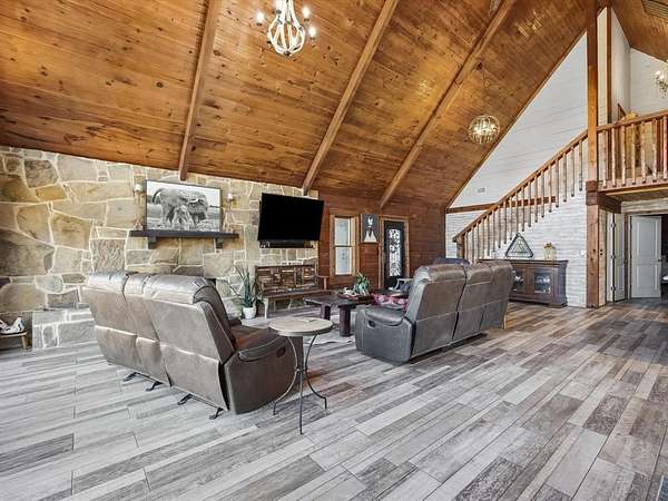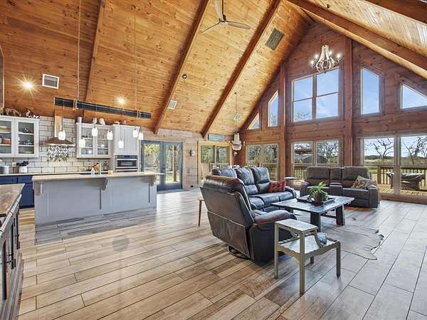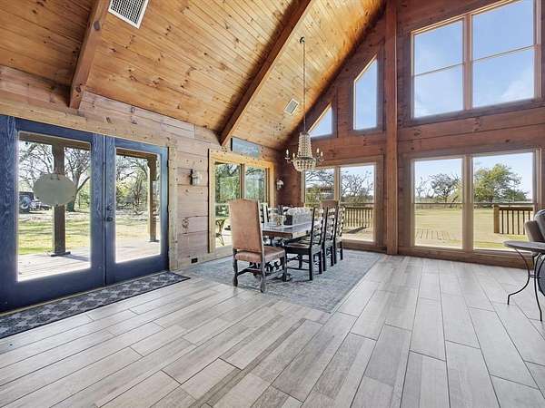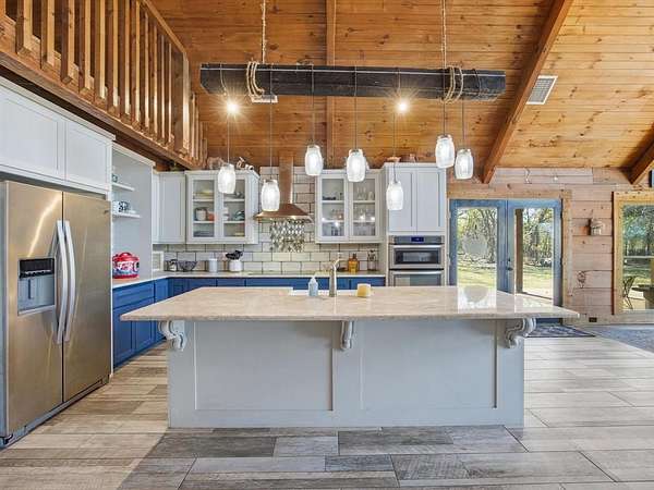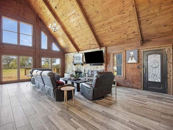 Acreage, privacy, and potential in Pilot Point. This 2.27 acre property delivers a rare combination of character, space, and flexibility just minutes from town. The main home features a vaulted great room with floor-to-ceiling windows, warm wood ceilings, a stone fireplace, and wide-plank flooring. The open kitchen includes a large island, decorative lighting, stainless appliances, double ovens, and excellent prep space.