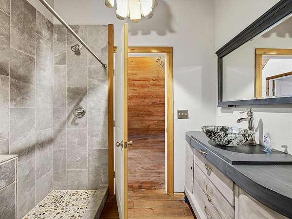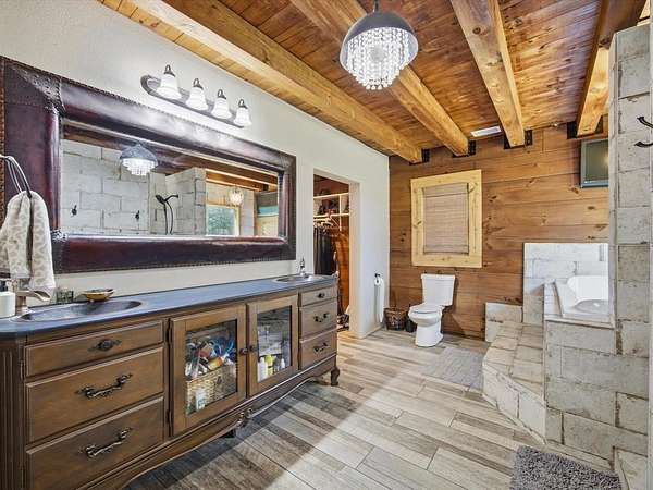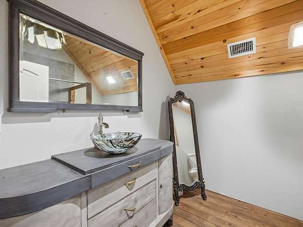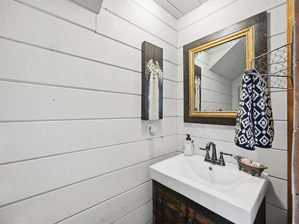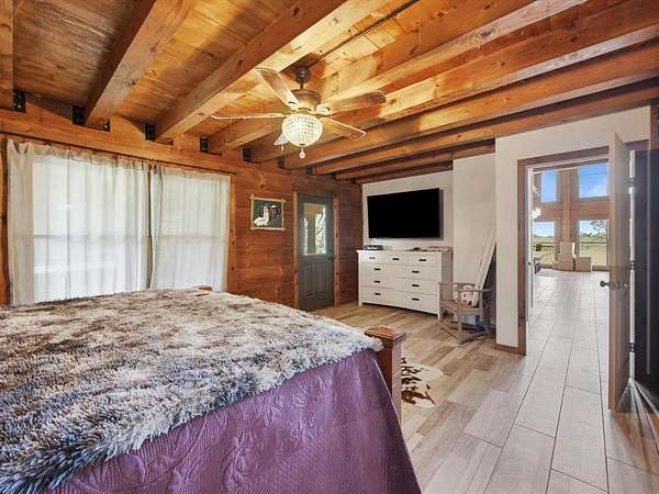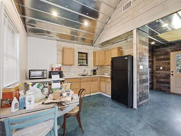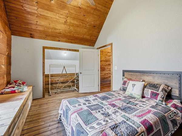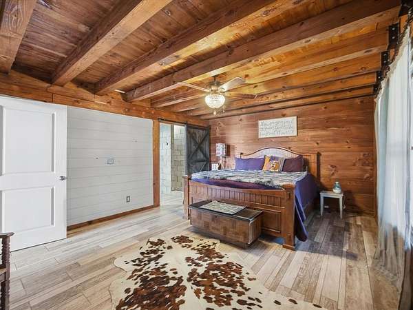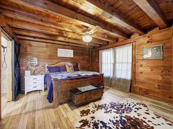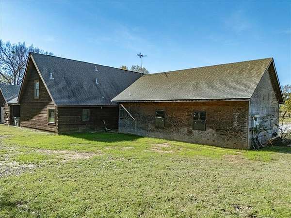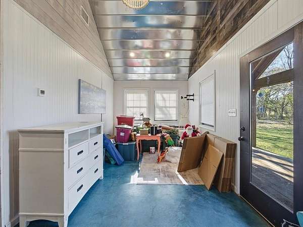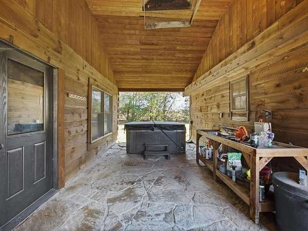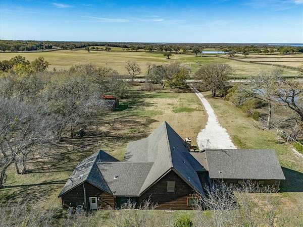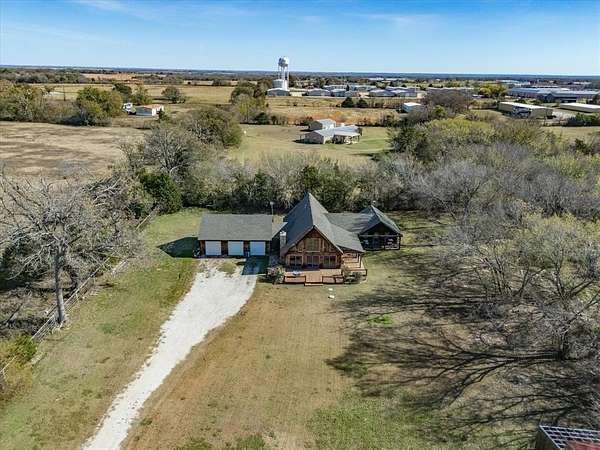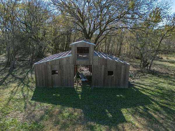 The primary suite sits on the main level with a walk-in closet and spacious bath. A second bedroom and loft space upstairs provide additional living, work, or guest options. Multiple porches and patios overlook mature trees and open yard space. In addition to the main home, the property includes a detached 3 car garage and a separate accessory dwelling unit, ideal for guests, storage, hobby space, or future income. Both structures offer room for finish out and customization. The stable building has begun construction and is ready for a new owner to finish out. The detached garage is currently framed and sheathed, offering a clean slate for exterior skin and interior finish out. No HOA. Private well. Coop electric. Private sewer. Pilot Point ISD. With solid bones, unique architecture, and multiple structures already in place, this property is perfect for someone looking to bring their own vision to life on acreage.