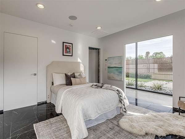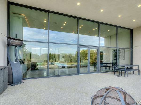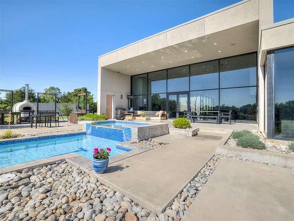 A dramatic 35-foot curtain wall captures panoramic views of the lap pool and surrounding countryside, seamlessly merging indoor and outdoor spaces. Interior details include soft-close cabinetry, concealed hinges, polished concrete floors, and FireClay tile in both baths.