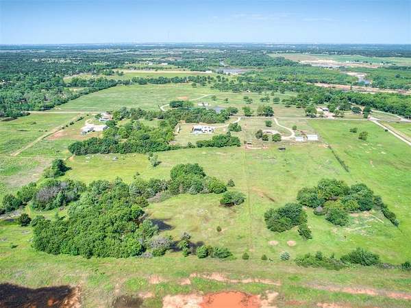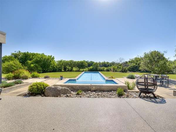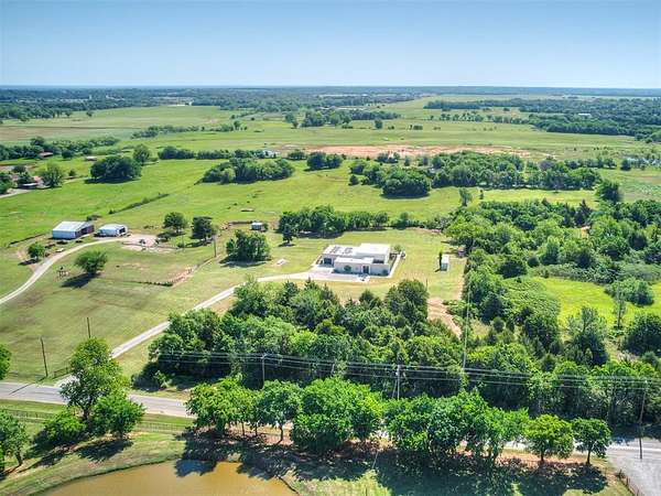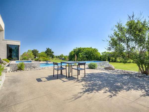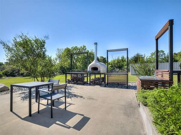 Outdoor living impresses with an epoxy patio, outdoor kitchen, Mugnaini wood-fired pizza oven, zero-scaped pool area with new pump and tile, and turf dog run. The 10-acre property offers two ponds, mature trees, a fenced section for horses or hobbies, and plenty of room to build a shop or barn. A large storm shelter and 40-foot shipping container with conduit for power add function and extra storage.