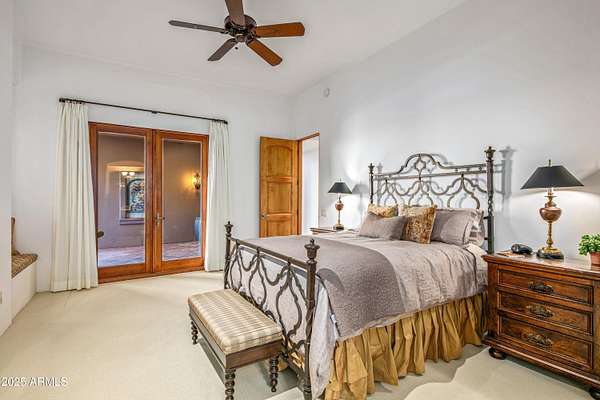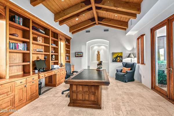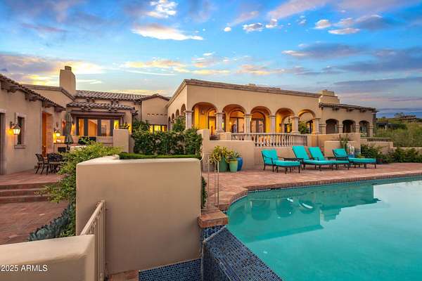 Golf Membership Available- Nestled into the hillside of the prestigious Desert Mountain community, this extraordinary estate embodies the romance of Spanish Mediterranean architecture blended with a refined, desert-inspired sophistication. Thoughtfully designed with a combination of rustic textures and elegant finishes, this residence exudes a sense of comfortable luxury, perfect for both serene everyday living and grand entertaining. A long paver driveway leads to an expansive motor court surrounded by mature desert landscape and a dramatic boulder outcrop. Inside, a soaring 18' vaulted plank-and-beam ceiling greets you in the foyer, anchored by an elegant iron chandelier. Arched windows frame the serene front courtyard with fire feature, setting the stage for refined indoor-outdoor living. The great room continues the architectural narrative with matching ceiling detail, soft cove lighting, and clerestory windows that usher in warm ambient light. A commanding cast-stone fireplace serves as the focal point, flanked by a built-in dry bar that seamlessly blends form and function. Three sets of French doors with arched transoms open to the elevated rear terrace, offering breathtaking panoramic vistas of the Southern Hemisphereincluding mesmerizing sunsets, twinkling city lights, the rolling majesty of the mountains, and the stunning natural beauty of the Sonoran Desert. Outside, the resort-style backyard is a masterpiece in itselfdesigned to indulge every outdoor desire. A 40-foot negative-edge pool appears to spill into the horizon, while meandering stone patios lead past rose gardens and lush vines to covered living spaces, sun decks, and dining areas complete with a built-in grill. Squared columns, graceful arches, and uninterrupted views elevate the alfresco experience to something truly magical. The heart of the home is the chef's kitchen, a warm and welcoming space that features rich Knotty Alder cabinetry with upper glass-front displays, detailed crown molding, and a contrasting painted island topped with a butcher block counter and seating for two. An ornate wrought iron chandelier is set into the recessed ceiling, while the oversized walk-in pantry offers extensive built-in storage, counters, and cabinetry. Adjacent to the kitchen, a cozy den invites quiet moments by the fireplace. French doors open to an outdoor grilling station and spacious patioperfect for morning coffee or evening cocktails under the stars. A formal dining room offers its own unique flair, with a faux-painted ceiling, dramatic cove lighting, and arched French doors that frame views of Apache Peak and the lush front courtyardblending refined indoor ambiance with the tranquility of the outdoors. The east wing of the residence begins with a beautifully appointed office featuring custom built-ins and French doors that open to a private, garden-like patio with a soothing water feature. A flat-arched art alcove leads to the primary retreatan extraordinary ensuite sanctuary featuring a vaulted, beamed ceiling, fireplace with sitting area, and arched windows and doors that capture panoramic desert and city views. Step outside to a private spa patio with seamless access to the backyard, ideal for moonlit soaks or sunrise meditation. The spa-inspired primary bath is a symphony of comfort and design. Dual vanities, a luxurious stone-surround soaking tub, and a doorless double-entry shower with stone tile, linear bench, and operable windows offer an indulgent escape. An adjacent steam room with additional showerhead and bench provides the ultimate wellness retreat, while two private water closetsone with a bidetadd discreet convenience. Two walk-in ultra custom closets are expertly designed with abundant shelving, drawer systems, and center island. The dressing space provides a three-way full-length mirror, built-in bench seating and linen cabinets galore. A separate corridor from the dining room leads to the west guest wing, where a scrolled iron door opens to