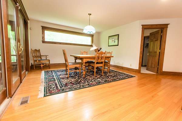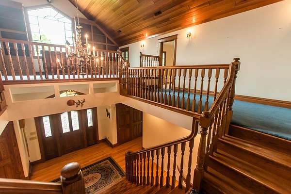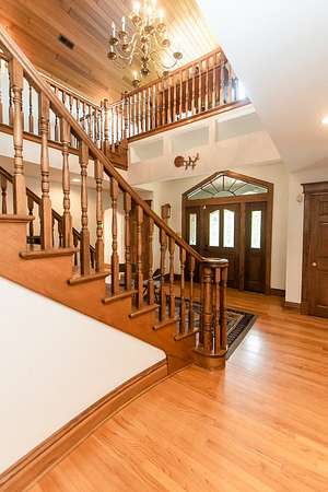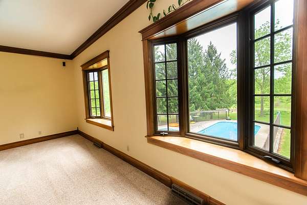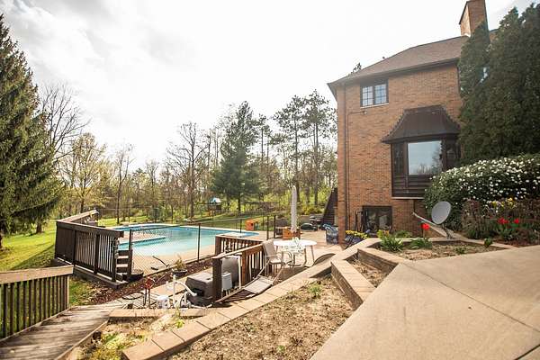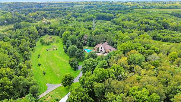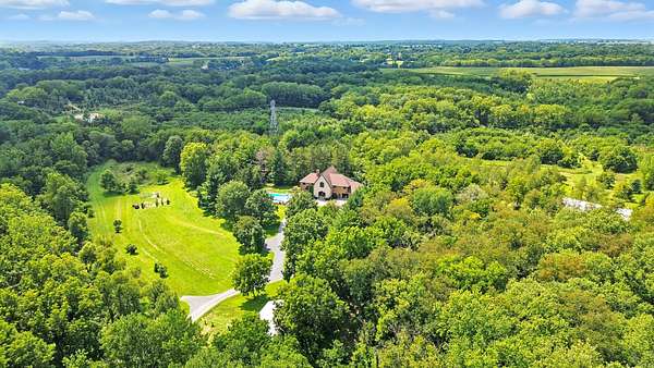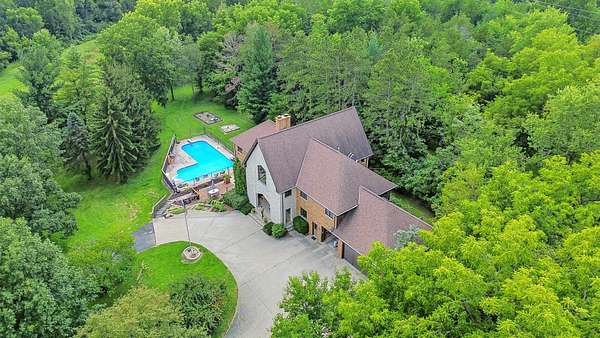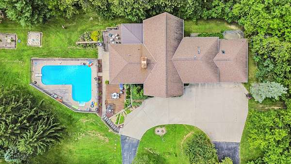 Sprawling homestead just outside of town with all the perks of being in the county but one minute from town. This stunner is a two story brick and stone home with a full finished walkout basement that leads to patio and deck area with L-shaped double in ground pool. The eye catching two story entryway with grand oak staircase welcomes you into the home. Large living room with built in book shelves and woodburning fireplace has views of the park like yard and pool area. There is an eat in kitchen plus formal dining room that opens to the screened porch. The main Floor also has a bedroom and full bathroom. 2nd floor of this home features a library and 6 additional bedrooms with 4 full bathrooms. The primary bedroom is off of the library and features a full bath with double sinks and walk in closet plus views of the pool. The custom oak spiral staircase takes you to the loft area that looks out to the back of the property. This unique property has so much to offer including 30x60 outbuilding and an additional 4 acres for sale that can be purchased with a pond.