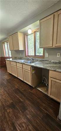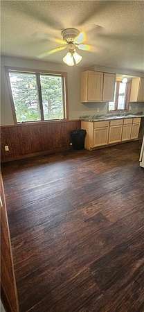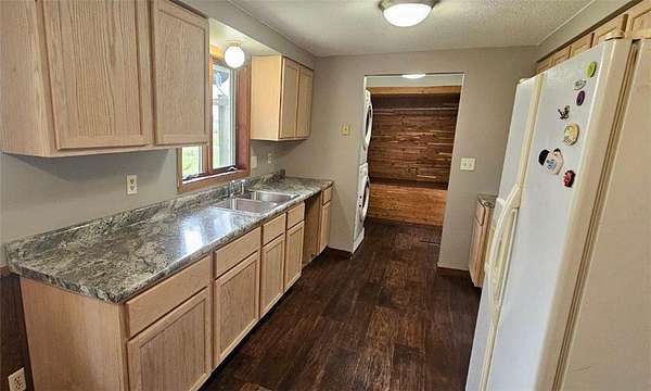 The ranch-style home features three main-level bedrooms, laundry hookups on both levels, a newly updated kitchen with modern cabinets, a convenient lower-level kitchenette, a new deck, and an attached two-stall garage. Plumbing to house for a outdoor wood burning system for in-floor heat.