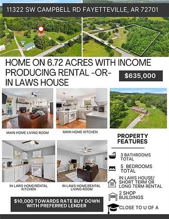 Two homes on over 6 acres, just minutes from everything Fayetteville has to offer. This unique property features a primary residence plus an active income producing short-term rental, long-term rental, or private in-law quarters.The main home offers approximately 1,900 square feet with a flexible layout featuring 4 bedrooms plus an office or 3 bedrooms with two offices, perfect for today’s work-from-home lifestyle. Enjoy cozy evenings by the wood-burning stove & entertain outdoors on the spacious back deck overlooking the peaceful acreage. The detached residence is a proven income-producing opportunity or private guest home, featuring one large bedroom, generous living room, full bathroom, and an oversized garage with abundant storage.An additional shop building provides even more functionality—perfect for woodworking, hobbies, or storing recreational equipment & toys.Located just 10 minutes from the U of A & 8 minutes from Baum-Walker Stadium. $10,000 seller credit to buyer when using preferred lender!