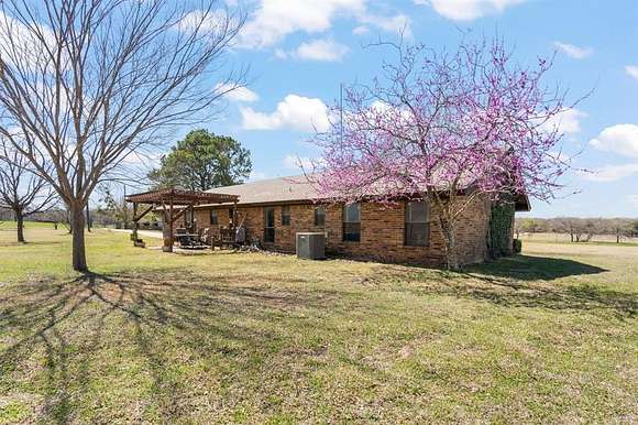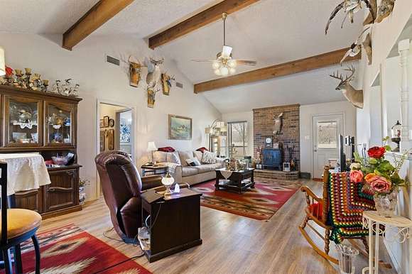 Discover the perfect blend of country living and modern comfort on this stunning 62-acre ranch. This property features a 3-bedroom, 2-bathroom home with a spacious kitchen that seamlessly opens to a cozy breakfast room. The formal dining room is open to living area that has an electric stove, raised ceiling with exposed beams and this layout is ideal for both everyday living and entertaining. Great size bedrooms down the hall with storage space. Primary bedroom has walk in closet and ensuite bath with shower. Large vanity in second bathroom. Step outside to enjoy the pergola-covered back patio, perfect for relaxing and taking in the peaceful surroundings. The land itself is a dream, offering a mix of open pasture, mature trees, and a pond, ideal for livestock, horses, or recreation. Cross-fencing is already in place, providing easy management of animals. Hunters dream, dear, turkey and more on the property. The front has costal pastures used to cut hay.
