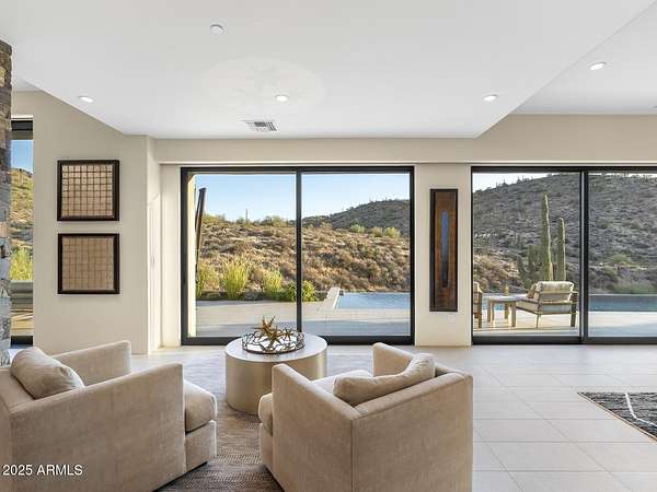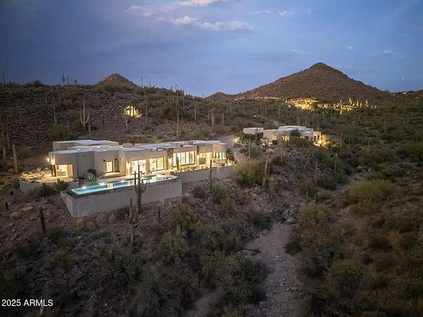 LIVING within a PRESERVE setting. Through 2 gates, this 6.5-acre flag lot offers a long private drive, boasts total privacy and tranquility!! Bordered a 680-acre property, ensuring privacy and protection. As you drive down its impressive 770-foot-long driveway, you'll immediately feel the serenity and seclusion it provides. The main house offers 3,636 sq ft of luxury, featuring 3 bedrooms, 3 bathrooms, and a dedicated office. Enjoy entertaining in the exquisite pool/bar room. A remarkable 16-foot disappearing wall of glass effortlessly blends indoor and outdoor spaces, providing breathtaking views of the city lights and, undisturbed mountain oasis. The brand new kitchen is a chef's dream, equipped with top-of-the-line Sub-Zero refrigerator, Wolf appliances, and custom cabinets - see more. A thermostat-controlled wine room and Sub-Zero ice maker in the custom bar elevate your entertaining experience. Enjoy modern living with a new HVAC system, all new windows and sliders, and a state-of-the-art Control 4 system managing your gate, cameras, shades, thermostats, lighting, and music. Gas-fired fireplaces and a fire pit create a warm and inviting atmosphere for gatherings. The property features brand new patios, a stunning infinity-edge pool, and top-notch pool equipment, surrounded by extensive landscape irrigation for lush greenery. The entire driveway and turnaround are newly paved, complemented by custom garage doors, and redundant wastewater pumps for seamless city sewer access. This grandfathered 1,933 SF guest house offers an additional layer of luxury with a complete kitchen, two baths, and two bedrooms, making it perfect for extended family. This exceptional property combines modern luxury with unparalleled privacy, making it a rare ONE of ONE find in Scottsdale.
