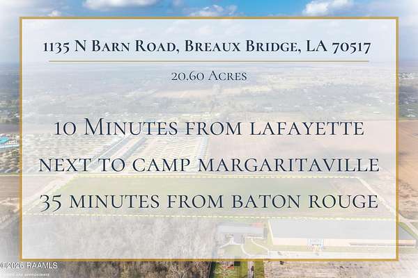 Est $7,422/mo20.60 Acres located between Camp Margaritaville RV Resort and Cajun Fast Track/Prehistoric Park with more land available!!! This property is full of possibilities. 35 minutes from Baton Rouge and 10 minutes from Lafayette. Take advantage of this opportunity today.