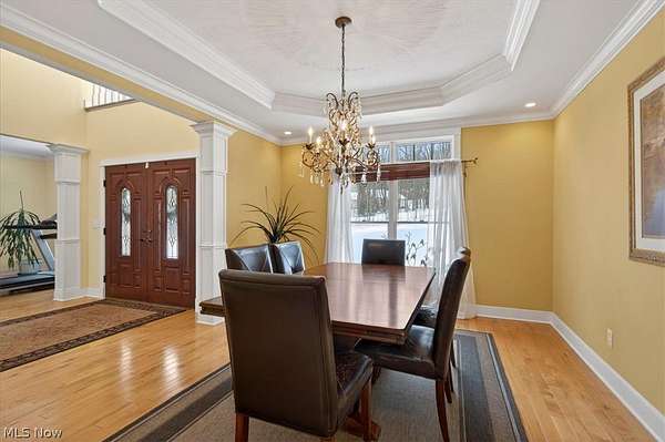 5 Bedrooms & 5 FULL Bath Quality-Built Colonial beautifully set on 2.5+ Private acres! This stately home offers over 5,200 finished sqft of Living Space, Beautiful Millwork, Crown Moldings, built-ins and Maple Hardwood floors throughout on First and Second level. 2-story Foyer opens to both Formal Living and Dining Rooms. Gourmet Kitchen with Cherry Cabinets, Granite Counters, center island, Breakfast bar, new glass backsplash, stainless steel appliances and butler's pantry. Breakfast Room with Vaulted Wood ceiling and access to New TREX Deck to enjoy Wooded Views. Family Room with Built-in Cabinetry, Bookshelves and Stone Gas Fireplace. 1st floor also includes Home Office, Mudroom & Full bath. Second level offers 4 spacious Bedrooms each with bath access, Library/Study with new French doors, convenient Second Floor Laundry Room & 3 full baths. Large Master Suite with Dressing area, Walk-in Closet and Luxury Bath with Garden tub, Separate shower, Double sink Vanity and marble floors. Full Finished Lower Level includes Rec/Family Room with Gas Fireplace, Impressive new Wet Bar with Ceramic Floors, Dinette area, Theater Room, Exercise room/5th Bedroom, Full Bath and Walk-out to Backyard Private Patio. Professionally landscaped yard with Exterior lighting and New brick front steps. Security System, Custom Blinds & many rooms have been freshly painted. 3-car Attached Garage. Chardon Schools. Don't Sleep on it or you Won't Sleep in it!