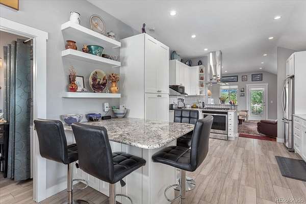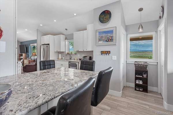 The 3-bedroom, 1.5-bath home was completely remodeled in 2018 and features granite counters, a gas range, tile and hardwood flooring, and a Lopi gas log stove. Oversized windows and a wraparound deck take full advantage of the mountain views and natural light.