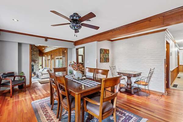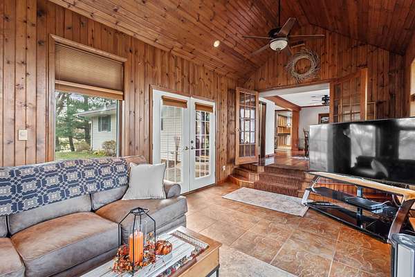 Just around the corner from Sandy Pines Golf course at the end of a dead end street is where you'll find this 6 acre estate! The sprawling 4 bedroom ranch is on a fully finished basement! As you enter from the paver lined patio that over looks your acreage, a full length enclosed porch/sunroom with heated ceramic floors welcomes you home. The kitchen boasts granite countertops & a copper backsplash while the dining room has hardwood flooring and tons of natural light. The rustic great room is a must see! With knotty pine walls, a vaulted ceiling, and a floor to ceiling stone woodburning fireplace.. this is a great spot to relax. There a numerous windows that overlook the 2 stage decorative ponds! There are 4 main floor bedrooms that are all nice sized and have custom solid oak trim, doors and accents! A custom tiled full bath with dual sinks & a dedicated laundry room round out this level. Need more space or a possible related living set up? Check out the finished basement. With approximately 1490 finished sqft, this area offers an enormous game room with a pool table, a 3/4 bath with a sauna and a 2nd full kitchen! Outside you'll find a paved drive with additional parking areas in front of the pole barn! This 34 x 40 barn serves as a garage currently. One bay is insulated with an A/C unit, electric heater and wood burner while the other half is cold storage. The acreage here is beautiful offering a great mix of spruce trees, maples and oaks as well apple trees, pear trees & grape vines! Other bonuses are the whole house generator and the brand new roof! Properties like this don't hit the market often... don't hesitate & miss out!
