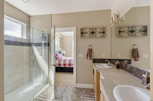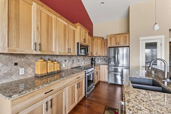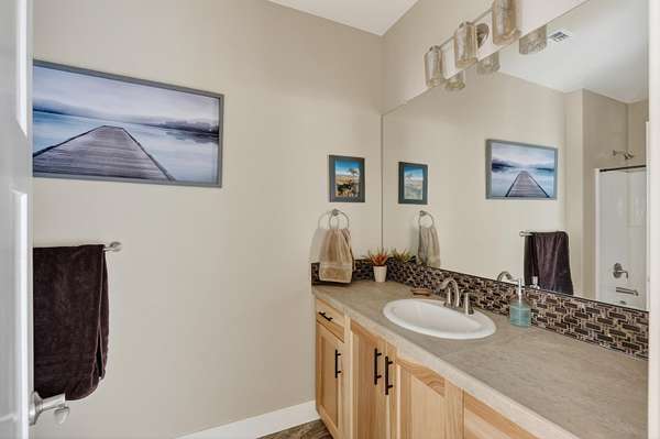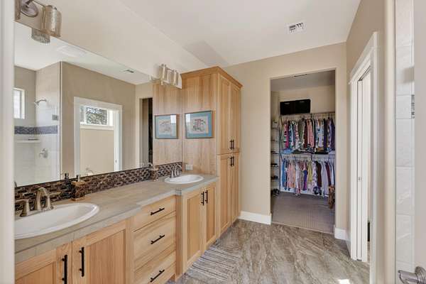 - Breakfast Bar, Ceiling Fan(s), Double Vanity, Granite Counters, Kitchen Island, Linen Closet, Open Floorplan, Pantry, Primary Downstairs, Shower/Tub Combo, Smart Thermostat, Tile Counters, Tile Shower, Vaulted Ceiling(s), Walk-In Closet(s), Wired For Sound
