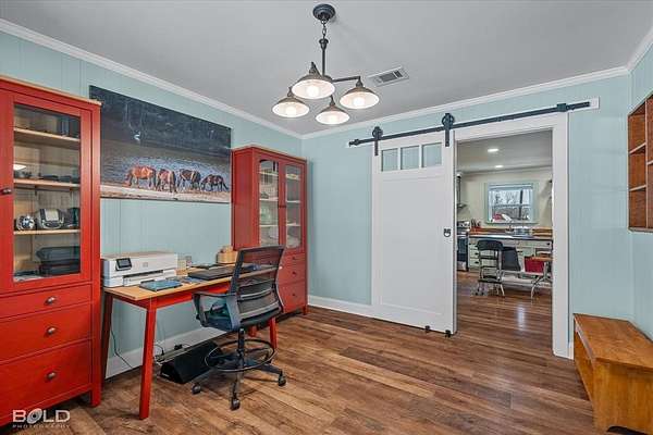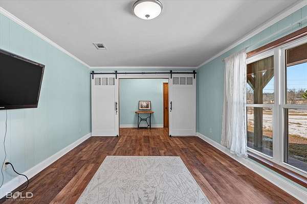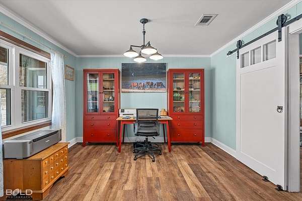 Equestrians will appreciate the exceptional setup: a four-stall barn with tack and feed room, including three oversized stalls with attached run-outs, plus a separate hay barn divided for storage and workspace with two additional horse stalls. The land is expertly laid out with four individual paddocks--each equipped with its own water source and shade trees--a designated riding arena, and a large separate pasture suitable for grazing or hay production.