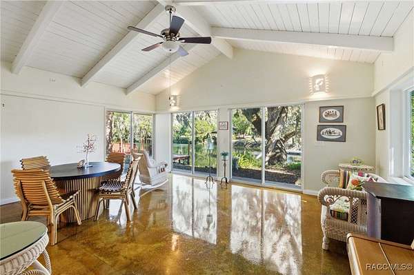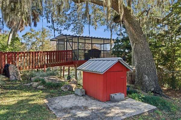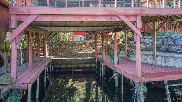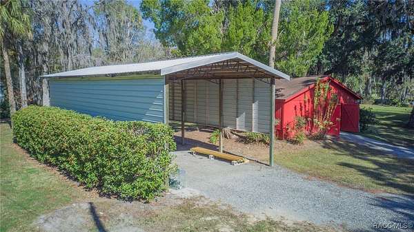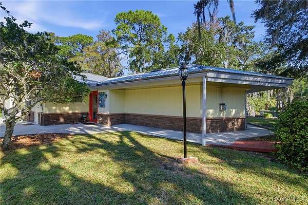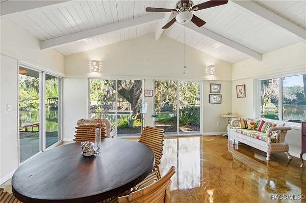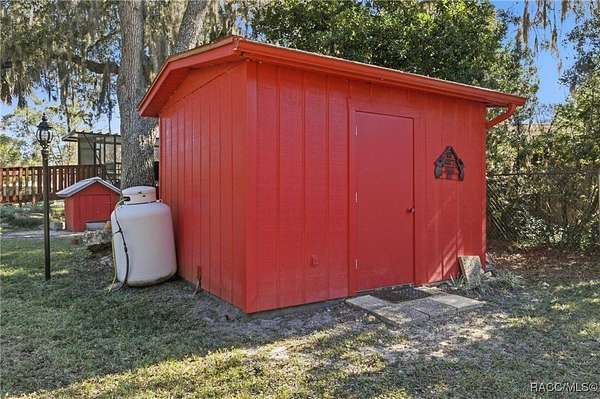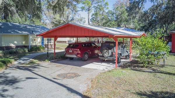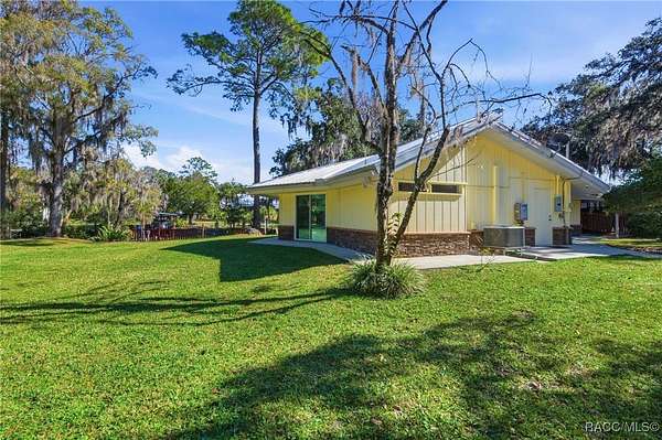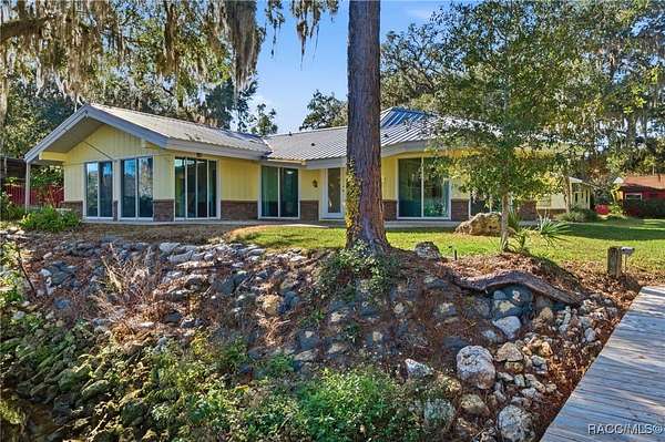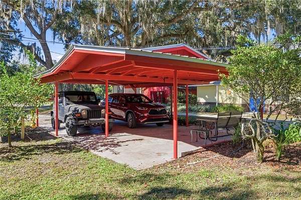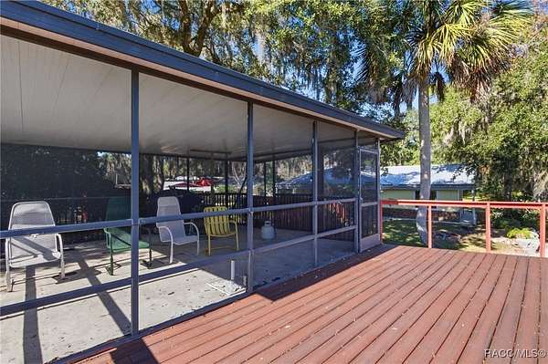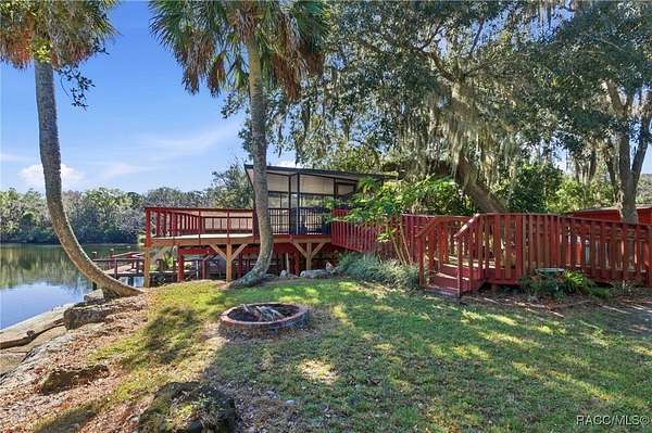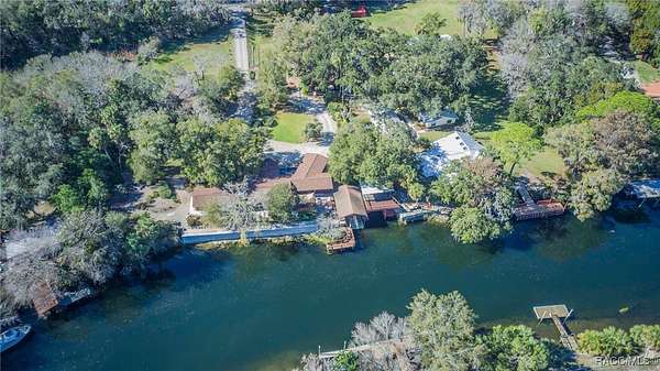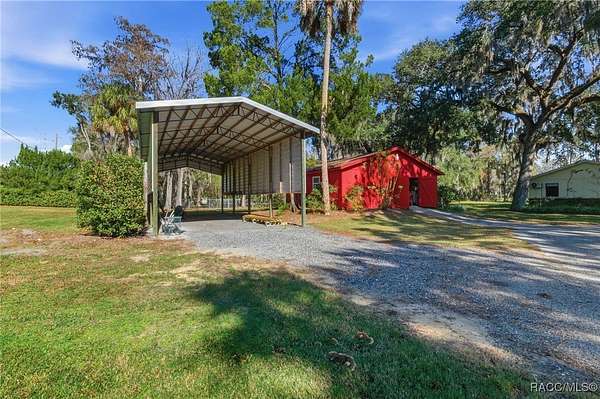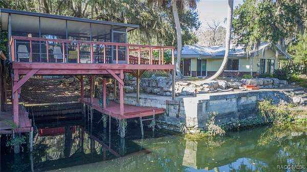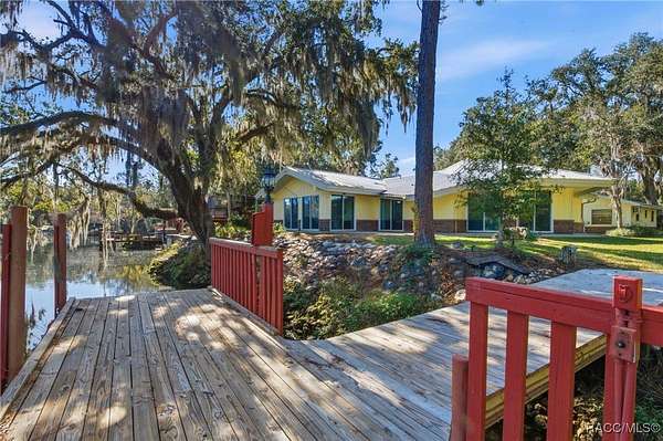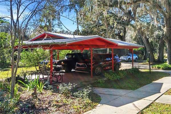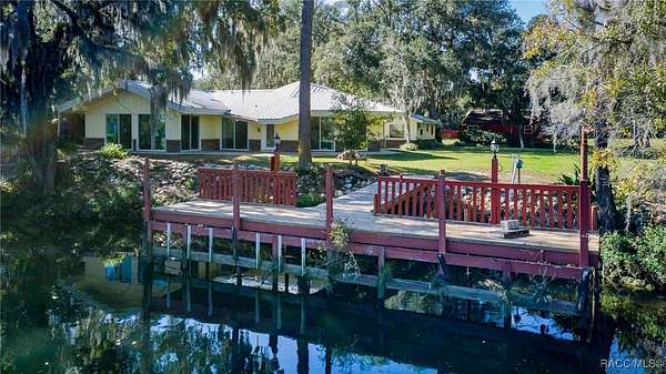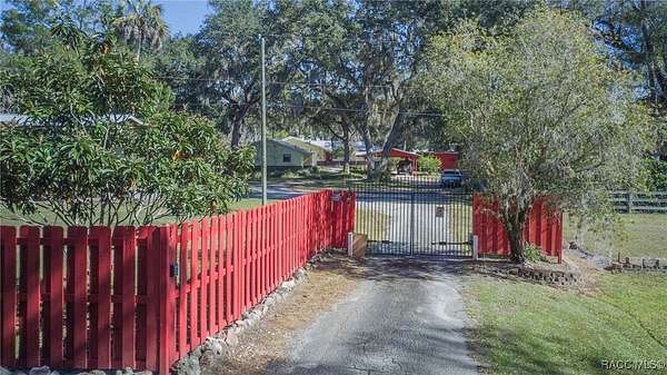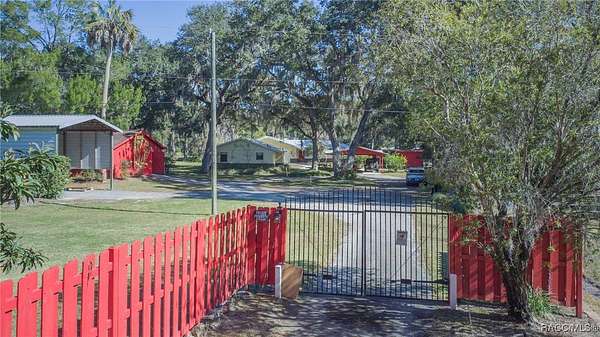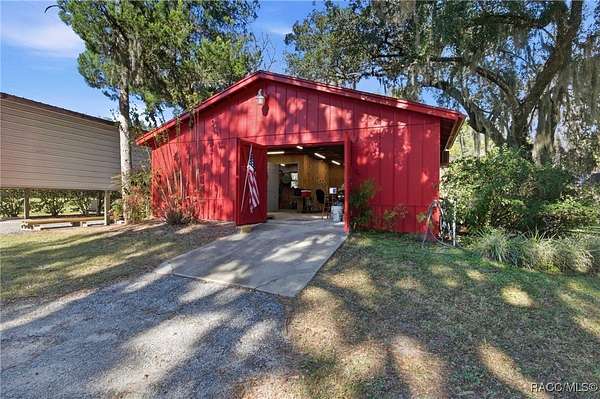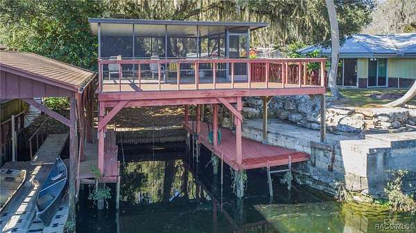 The alure of the "old Florida" lifestyle is a theme local artists and authors have been preserving in print and canvas since the first pioneer set eyes on the new territory called Florida! As we all know, nothing stays the same in the modern age of Florida, or does it? This picturesque setting along the Withlacoochee River, An Outstanding Florida Waterway, has all the elements that one considers "old Florida". Starting with the famous river with palm trees stretching over the bank alongside the majestic live oak trees scattered across 1.8 acres of total serenity! The property is fully fenced with an electric gate at the entrance, and the riverfront features two docks suitable for almost any size and style boat of your choice. The cut-in boat slip below the ultimate upper deck screened room for viewing magnificent sunsets reflecting in the sky and water. The main house has a remodeled gourmet kitchen and sophisticated primary bath with cedar-lined walk-in closet, but the vibe is pure 60's with exposed beam and tongue-and-groove wood cathedral ceilings throughout the house from living area to primary bedroom. The river is ever-present out any one of the numerous sliding glass doors bringing the spirit of the river indoors. The multi-hued stained swirls of the concrete floor mimics the waters undecided flow from changing tides. With your new residence many family and friends are going to come visit. Welcome them with true southern hospitality by giving them a choice to stay in the guest house with full kitchen, two bedrooms and one bath; or, they may prefer their own RV! You can accommodate them in style under the 36ft RV port w/ 50-amp electric service and cleanout! Storage will not be a problem with a 26x28ft barn with double doors and complete with A/C and Heat for extended project times.