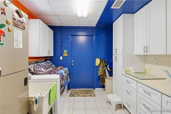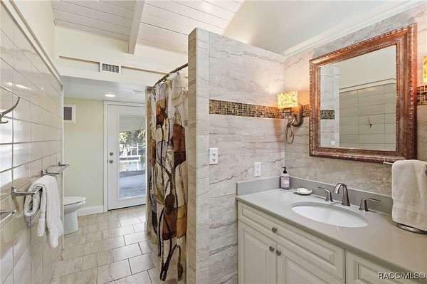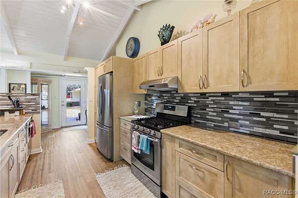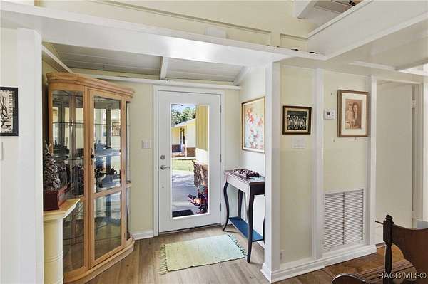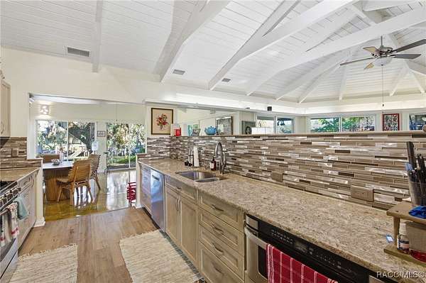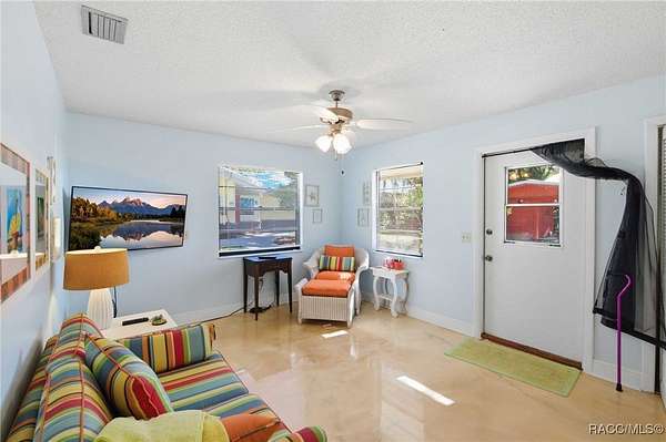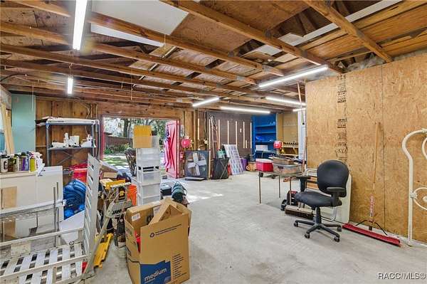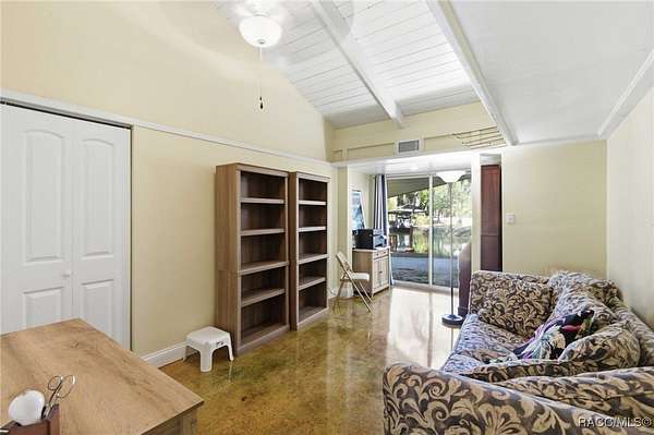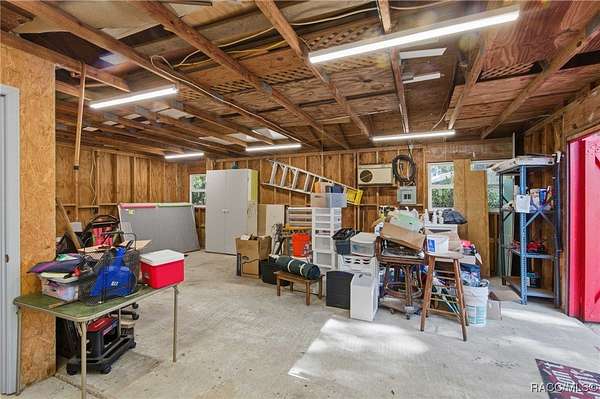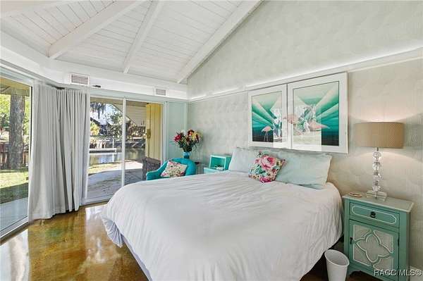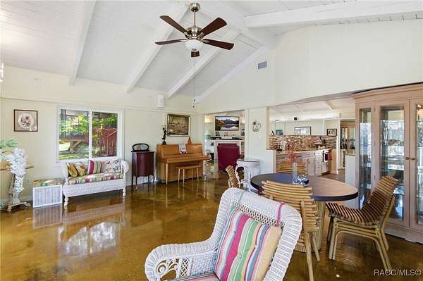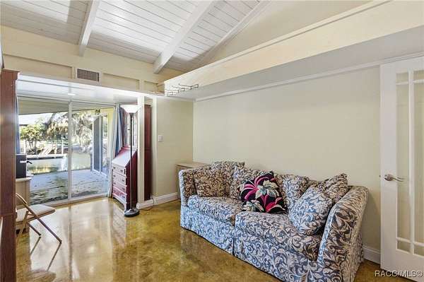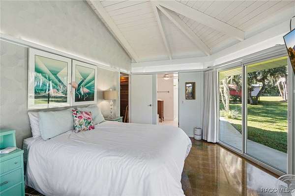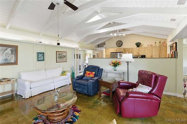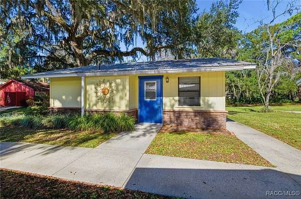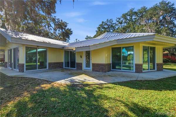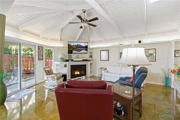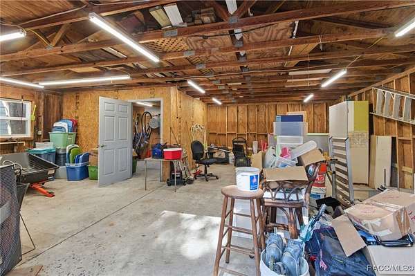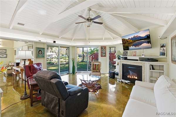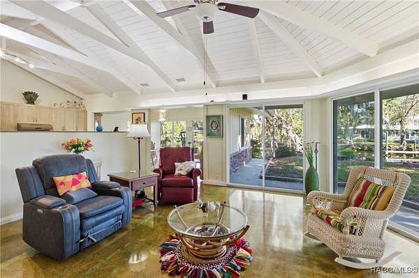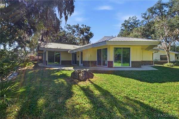 The alure of the "old Florida" lifestyle is a theme local artists and authors have been preserving in print and canvas since the first pioneer set eyes on the new territory called Florida! As we all know, nothing stays the same in the modern age of Florida, or does it? This picturesque setting along the Withlacoochee River, An Outstanding Florida Waterway, has all the elements that one considers "old Florida". Starting with the famous river with palm trees stretching over the bank alongside the majestic live oak trees scattered across 1.8 acres of total serenity! The property is fully fenced with an electric gate at the entrance, and the riverfront features two docks suitable for almost any size and style boat of your choice. The cut-in boat slip below the ultimate upper deck screened room for viewing magnificent sunsets reflecting in the sky and water. The main house has a remodeled gourmet kitchen and sophisticated primary bath with cedar-lined walk-in closet, but the vibe is pure 60's with exposed beam and tongue-and-groove wood cathedral ceilings throughout the house from living area to primary bedroom. The river is ever-present out any one of the numerous sliding glass doors bringing the spirit of the river indoors. The multi-hued stained swirls of the concrete floor mimics the waters undecided flow from changing tides. With your new residence many family and friends are going to come visit. Welcome them with true southern hospitality by giving them a choice to stay in the guest house with full kitchen, two bedrooms and one bath; or, they may prefer their own RV! You can accommodate them in style under the 36ft RV port w/ 50-amp electric service and cleanout! Storage will not be a problem with a 26x28ft barn with double doors and complete with A/C and Heat for extended project times.