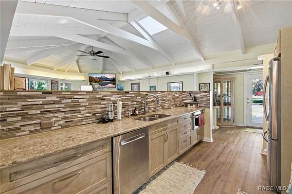 - Beamed Ceilings, Cathedral Ceilings, First Floor Entry, French Doors Atrium Doors, In Law Floorplan, Open Floorplan, Primary Suite, Separate Shower, Shower Only, Skylights, Sliding Glass Doors, Solid Surface Counters, Stone Counters, Updated Kitchen, Walk In Closets, Window Treatments, Wood Cabinets
