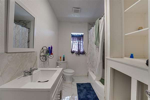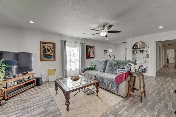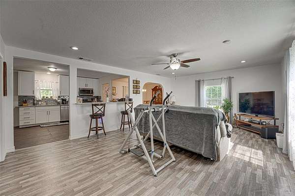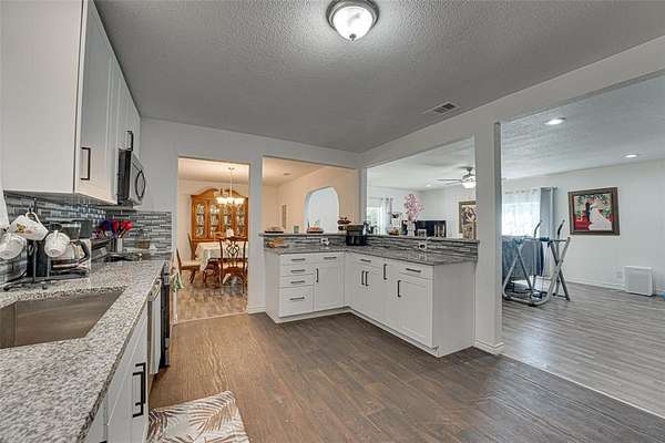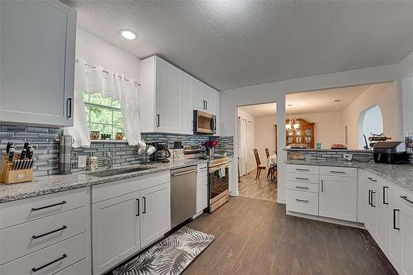The recently remodeled home, updated in 2023, features 2,120 square feet of spacious and flowing living space. It offers three large bedrooms and two full bathrooms. The living room is expansive and welcoming, complete with built-in shelving. The eat-in kitchen includes a breakfast bar, plenty of cabinetry and counter space, and opens to a formal dining room perfect for entertaining.