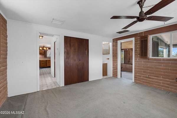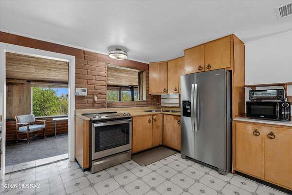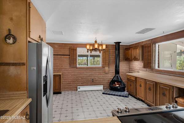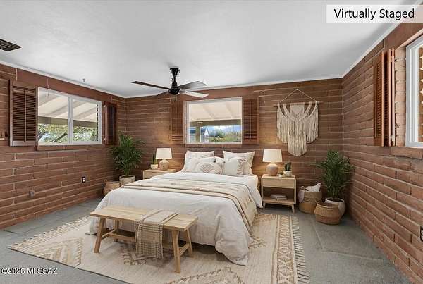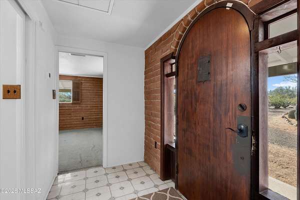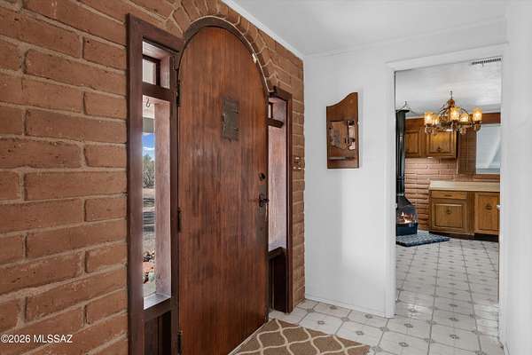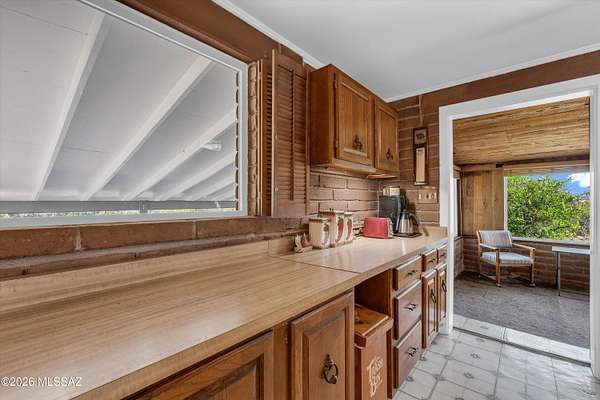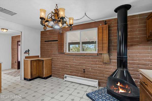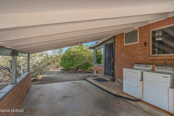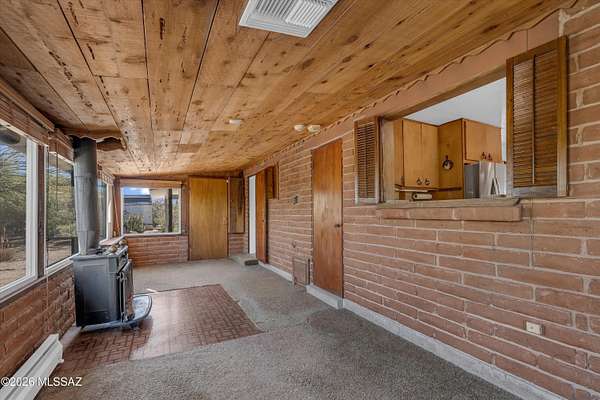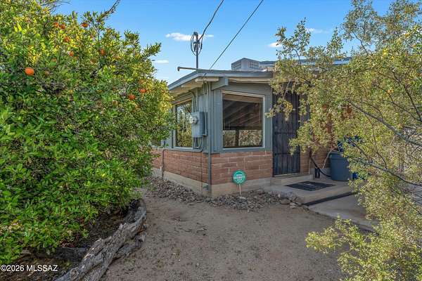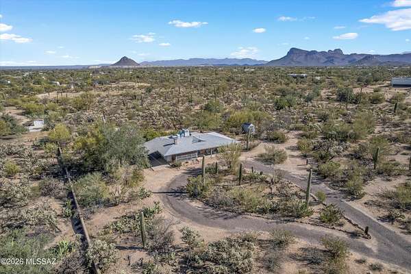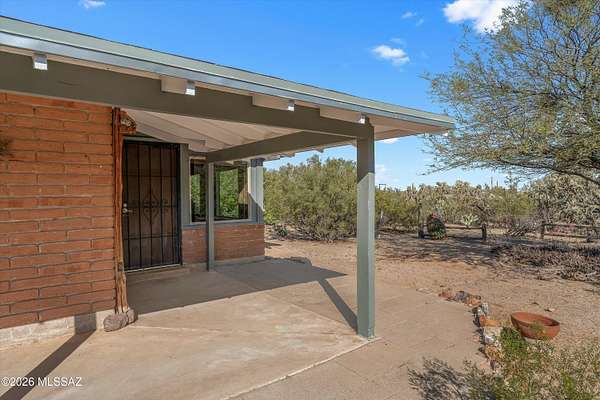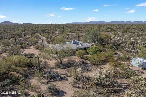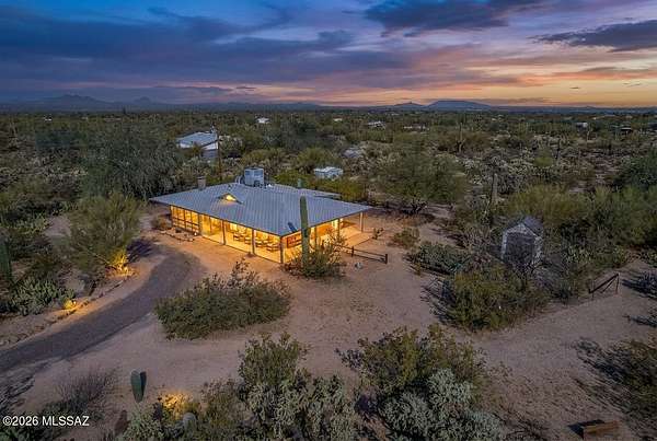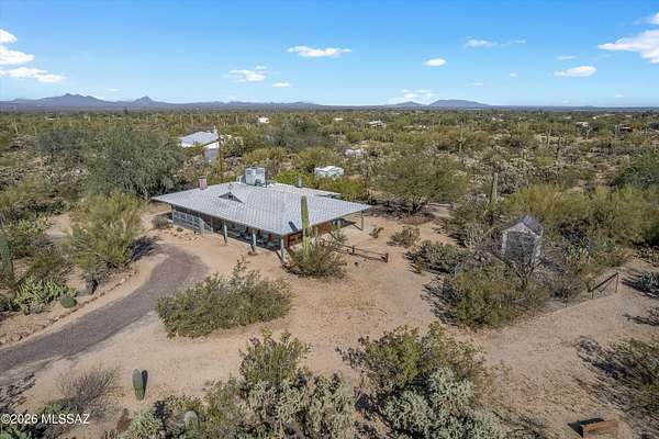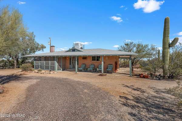 Discover the charm and versatility of this unique property. Featuring beautiful exposed adobe walls, warm wood ceilings, and cozy wood-burning stoves/fireplaces, the home blends rustic character with comfortable living. Enjoy peaceful desert living from the screened-in patio or the nearly complete wraparound porch, perfectly positioned to take in stunning sunrise and sunset views. Most windows are fitted with shutters, and a large picture window in the bedroom captures the surrounding landscape. Over 4 acres! Horse property. Incredible flexibility, ideal as an Airbnb or income-producing rental, or build your dream home and use the existing residence as a guest house or casita. Across from Saguaro National Park. 2 year old HVAC and water heater. A rare opportunity with endless potential!
