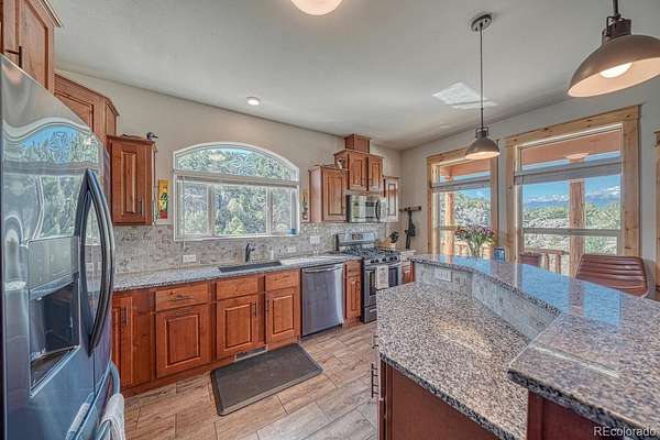 This gorgeous home is situated on 1.97 acres with epic Collegiate Peaks Views and Trout Creek running through it! It also borders public land on 2 sides. As you're welcomed into the roomy entry way, the home features gorgeous log accents and a stacked stone gas log for ambiance. Fantastic kitchen with lots and lots of storage, granite counters, concealed walk-in pantry, built in office nook and more! Step outside onto the log accented, wrap-around covered deck to take in the OUTSTANDING mountain views and soothing sounds of Trout Creek! The main level offers a great large Primary Bedroom with mountain views, walk in closet and a 3/4 en-suite bathroom featuring double sinks. There is also another bedroom and full bathroom on the main floor. Great main floor utility room with access to the double attached garage. Downstairs you'll find a super large recreation room with walk-out access to the back yard along with high ceilings. There is a nice sized bedroom, office and another 3/4 bathroom downstairs too. Lots of great storage and finishes throughout. This gem has a super convenient and private location just a few miles from Buena Vista! The information contained herein should be verified after buyer contracts to buy the property.
