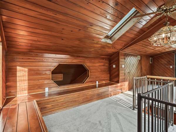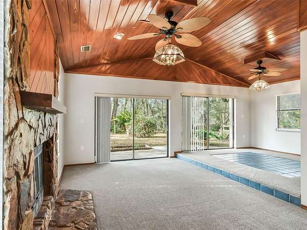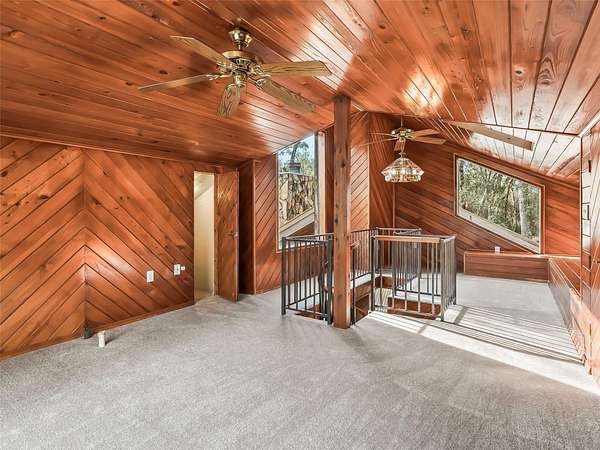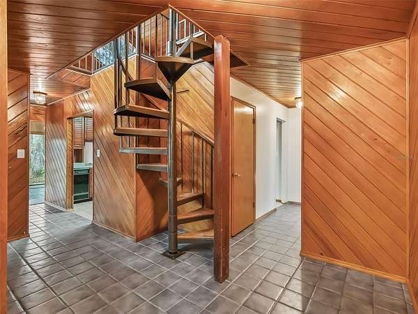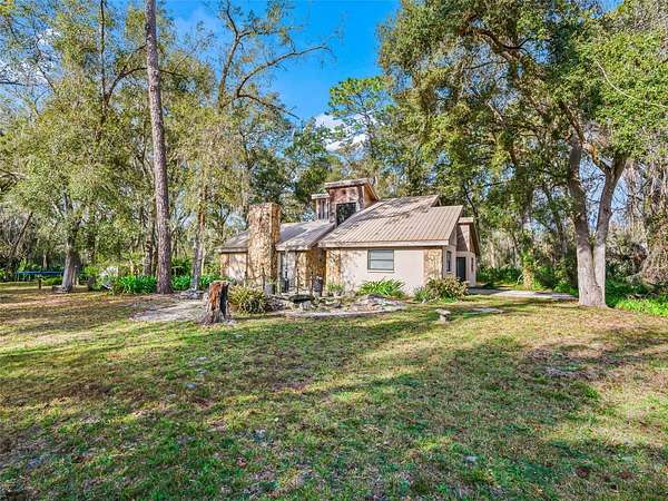 Tucked away on 2.5+/- wooded acres, this architecturally distinctive residence offers a rare blend of privacy, character, and creative potential. Surrounded by nature, the 2-bedroom, 2-bath block home is thoughtfully designed to blend seamlessly with its serene setting while providing a compelling foundation for refined customization. A dramatic spiral staircase serves as a sculptural focal point, ascending to a light-filled bonus retreat wrapped in rich cedar wood walls. An adaptable space well-suited for a home office, creative studio, entertaining lounge, or additional bedroom. Throughout the home, cedar wood ceilings add warmth and continuity, complemented by brand-new carpeting, while a striking stone fireplace anchors the main living space. Multiple sliding glass doors extend the interiors outward to patios and natures tranquial views, creating seamless indoor-outdoor living and entertaining opportunities. The primary suite functions as a private sanctuary, complete with its own bath and direct patio access. The unfinished patio and elevated entertaining area present an exceptional opportunity to further enhance and personalize the outdoor living experience. The grounds reinforce the home's retreat-like atmosphere, featuring a koi pond with a charming bridge, a fire pit, winding walking trails, including a concrete slab ideal for a future garage or workshop, along with a separate 10x20 storage building. Secluded, distinctive, and rich with potential, this one-of-a-kind property is ideal for those seeking a private woodland escape with the flexibility to craft a truly customized lifestyle. Perfectly balancing privacy with accessibility, it is conveniently located with easy access to I-75, U.S. Hwy 301, and State Road 50, offering a manageable commute to Ocala, Tampa, and Orlando. Just minutes from the Webster Flea Market, Sumter County Fairgrounds, and local shopping and dining. Outdoor recreation abounds with nearby lakes, nature trails, and the Withlacoochee State Forest. Enjoy the best of Florida living with Gulf Coast beaches and natural springs, approximately 45 minutes to one hour away. A rare offering where privacy, natural beauty, and architectural distinction converge is best appreciated through a private showing.