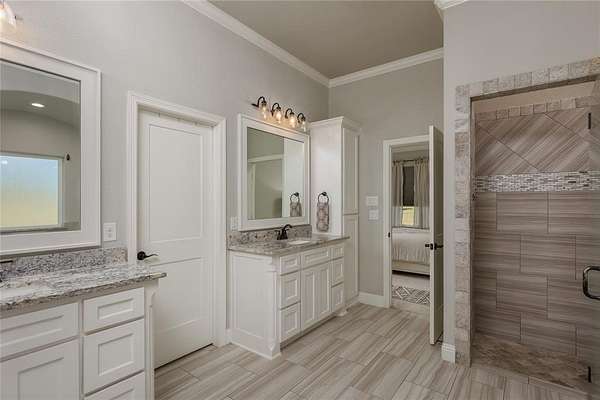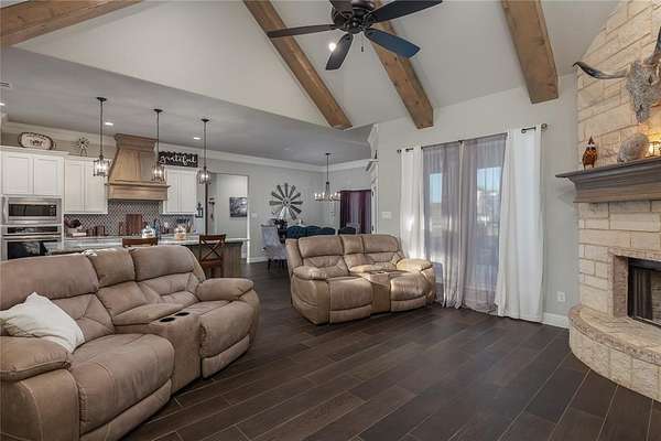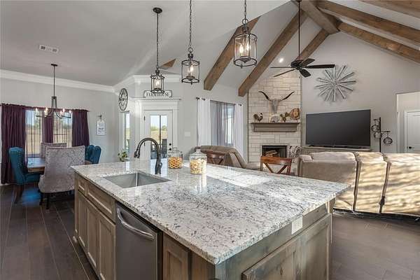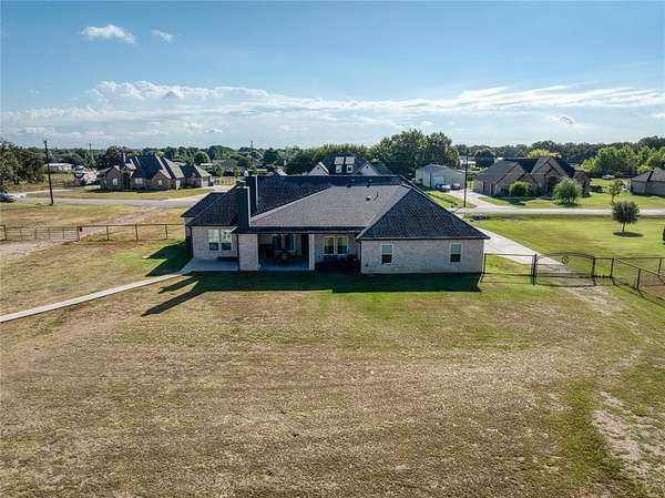 Step into luxury and space with this custom-built Ashlyn Homes masterpiece, situated on 2 acres just outside Springtown city limits. This elegant single-story home offers 4 bedrooms and 2 bathrooms in a split-bedroom floorplan, designed for comfort and refined living. You'll immediately notice the beautiful entry with custom tile leading into the study with French doors and an expansive living area anchored by a floor-to-ceiling stone fireplace framed by cathedral ceilings and wooden beams. The chef-style kitchen shines with a large island, custom vent hood, and a generous walk-in pantry. The primary suite is a retreat in itself, featuring a tray ceiling, a sitting area, and a luxurious bath with separate vanities, a soaking tub, walk-in shower with bench, and a massive walk-in closet. On the opposite wing, three additional bedrooms and a full bath ensure excellent space for family or guests. Storage and workspace are abundant: enjoy an oversized utility room with built-in cabinets, a mudroom bench, and room for a freezer. The attached three-car garage handles your vehicles, while a 30x40 insulated workshop with dual roll-up doors plus an additional 30x40 concrete pad with weld plates offer ideal space for your RV, boat, or hobby equipment. Outside, a covered back porch with wood-burning fireplace makes a perfect spot for relaxing evenings, and the large backyard connects you with country views and quiet privacy. This home enjoys the excellent Springtown Independent School District. Centrally located only a short drive to Fort Worth, Dallas, Springtown shopping, historic Springtown Square, and local amenities--this property strikes the perfect balance between serene country living and easy access to the city. If you're looking for a home that offers space to roam, room for everything, and high-end finishes inside and out, this one is a rare find.