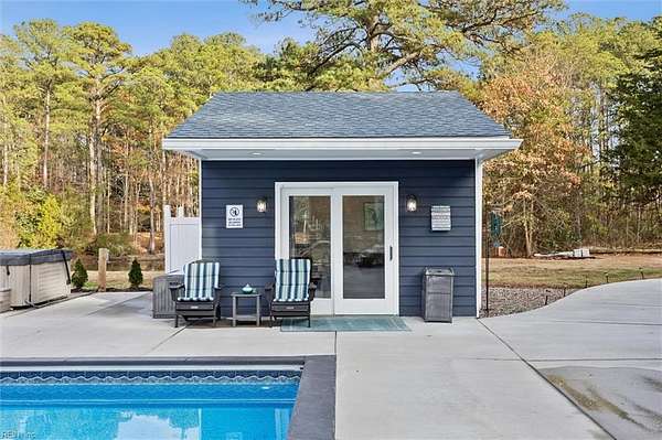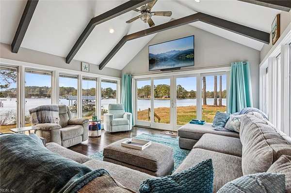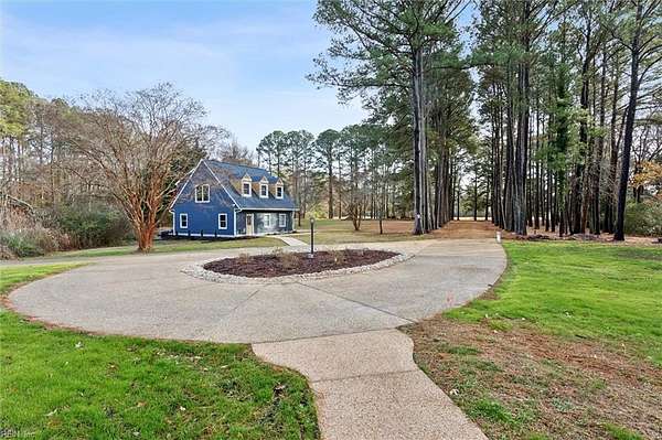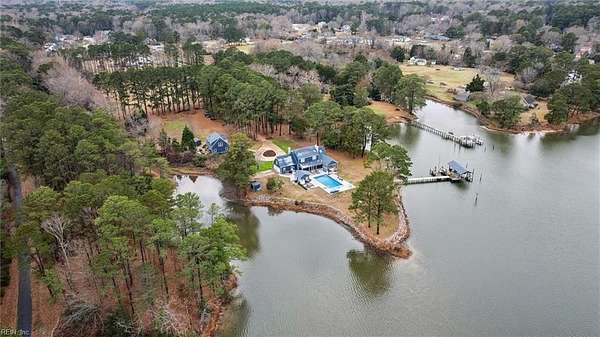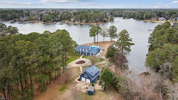 Extraordinary opportunity awaits at this rare, subdividable 10-acre waterfront estate in York County, set on a mostly cleared peninsula offering exceptional privacy and sweeping water views. The fully remodeled main residence features 4 bedrooms and 2.5 baths, including a first-floor primary suite and sun-filled living spaces. Just steps away is a heated/cooled 40’ x 20’ pool with safety cover and full-featured pool house for effortless entertaining and resort-style living. Behind the main home, a beautifully finished guest cottage sits above an oversized heated and cooled garage, convenient for guests, extended family, or rental potential. A private dock and boathouse offer approximately 4.5 feet of water at mean low tide. The expansive grounds include large cleared areas, abundant wildlife, and space for subdivision or a true estate lifestyle, with room for horses, chickens, roosters, and goats. All structures were remodeled in 2024–25, blending modern comfort with natural charm.