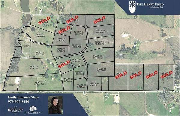 POND! Welcome to The Heart Field at Round Top, a Country Community by Terry Ward, where luxury meets nature. Situated on the coveted Hartfield Road in Round Top, Tract 16, 114 Hartfield Meadow Ln sits at 490? in elevation. With panoramic views, the 6.941 acres offers multiple ideal homesites; an open canvas waiting for your landscaping visions. The Heart Field at Round Top is designed for those who appreciate the finer things in life and seek a harmonious blend of privacy and community in a premier location. Located just minutes from the charming Round Top town square, The Heart Field provides easy access to local shops, restaurants, and cultural events, offering a vibrant lifestyle amidst a tranquil countryside setting. An added advantage for purchasing a lot in the Heart Field is that the entire community benefits from a wildlife valuation. Underground utilities. *Internet available. Experience the best of high-end country living in Round Top, Texas. Contact Emily Kahanek Shaw to find the property for your new luxury home!
