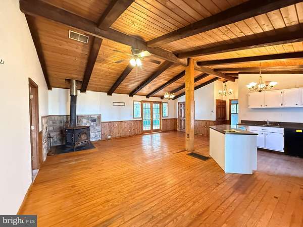 - Carpet, Ceiling Fan(s), Combination Dining/Living, Combination Kitchen/Dining, Exposed Beams, Family Room Off Kitchen, Island Kitchen, Open Floor Plan, Pantry, Skylight(s), Wood Floors, Wood Stove