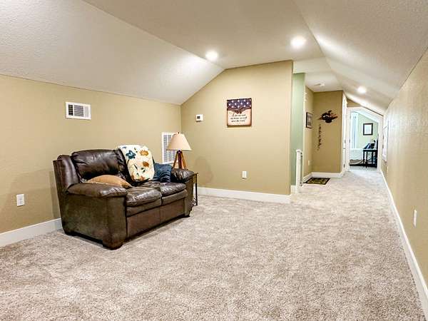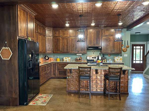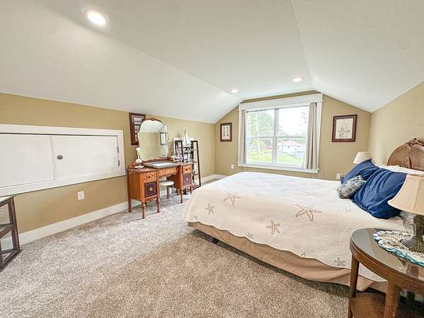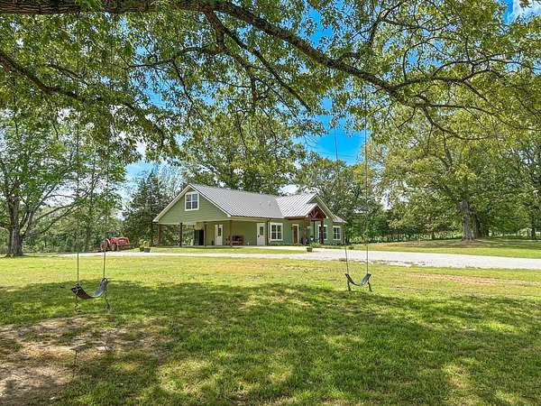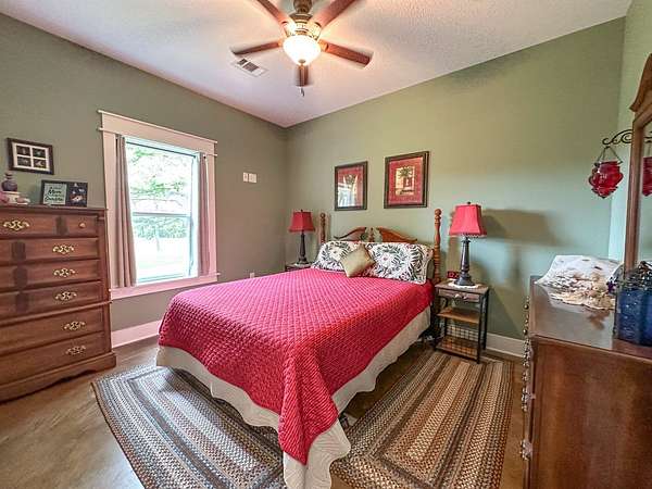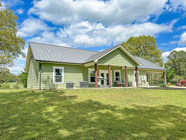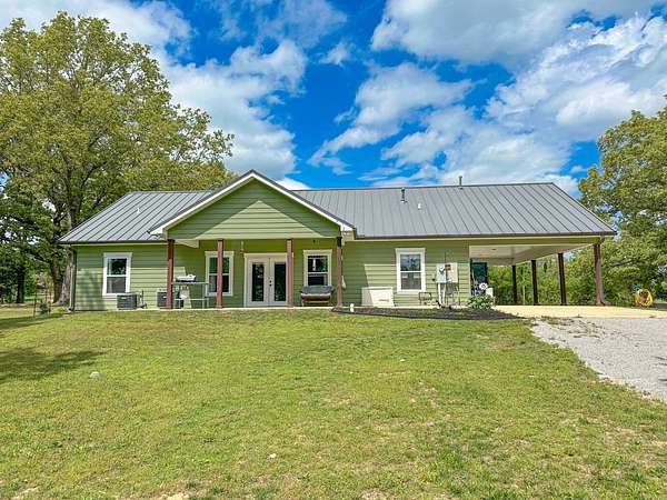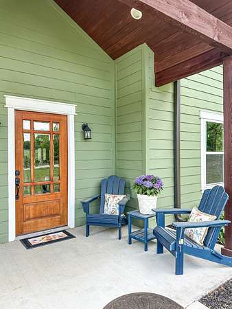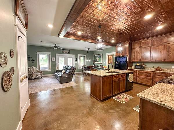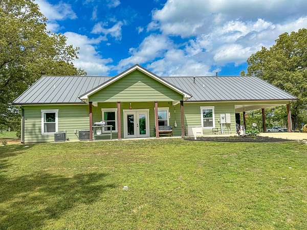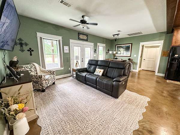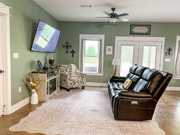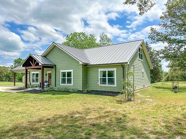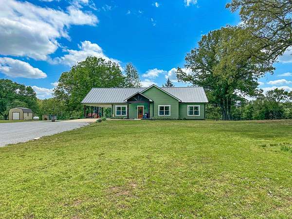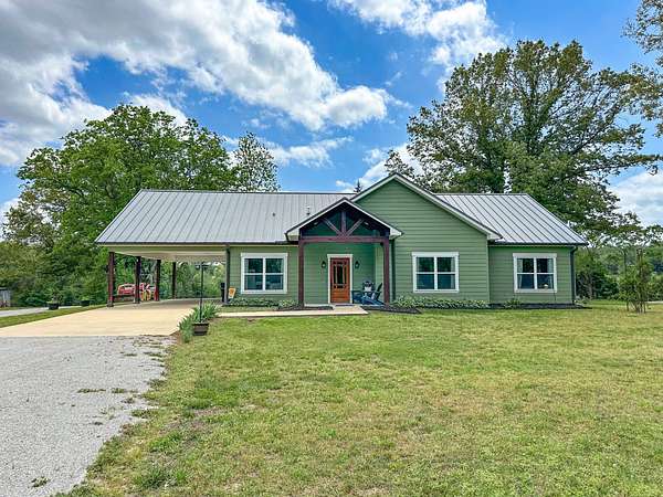This stunning 2,632-square-foot Craftsman-style home, built in 2021, captures your attention the moment you turn into the driveway. Upon entry, you'll immediately notice the custom features and thoughtful details that make this residence truly one of a kind-most notably, its comprehensive handicap accessibility throughout the main floor. A beautifully etched compass rose welcomes you inside. To your left, the laundry room offers convenient access directly from the drive-through carport. To your right, a spacious office provides the perfect space for work, study, or crafts. Straight ahead, the open-concept kitchen, dining, and living areas create a bright, airy atmosphere. The kitchen's copper ceiling tiles add warmth and character, while the gas cooktop and combination bake/air-fry oven make it a chef's dream. Granite countertops and custom cherry wood cabinets extend to the ceiling, offering both beauty and abundant storage. The primary suite was thoughtfully designed with full wheelchair accessibility. Both the bedroom and bathroom feature wide doorways and ample space for mobility. Additional ceiling support accommodates a lift and trolley system (not installed) for easy movement between the bed and bathroom. The bathroom includes an open sink design for wheelchair access and a ground-level walk-in shower for seamless entry. This suite also has a private entry/exit door directly connected to the carport. On the opposite side of the home, you'll find two comfortable guest bedrooms and a full bathroom. Upstairs, there's a spacious family room, two additional bedrooms, and another full bath-perfect for guests or a growing family. Step outside the back door onto the covered porch and enjoy serene views of the tree-shaded lawn, green pasture, and newly added pond. The expansive yard provides ample space for gardening, small animals, and outdoor play. A Bald Eagle Barn offers additional storage, complemented by an older shed for equipment. This thoughtfully designed property combines craftsmanship, comfort, and accessibility-making it a true must-see!