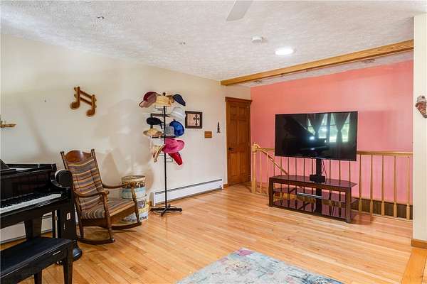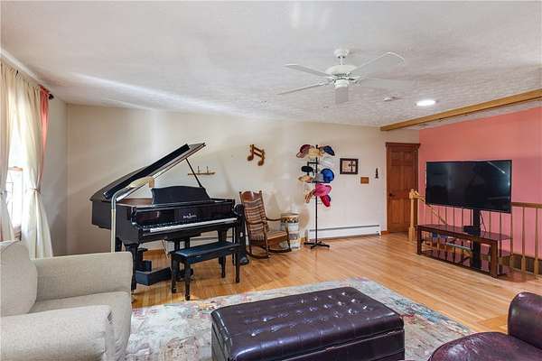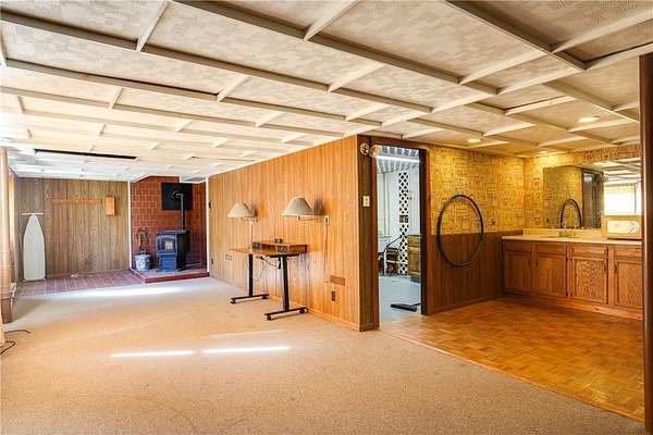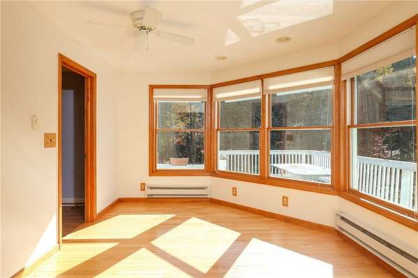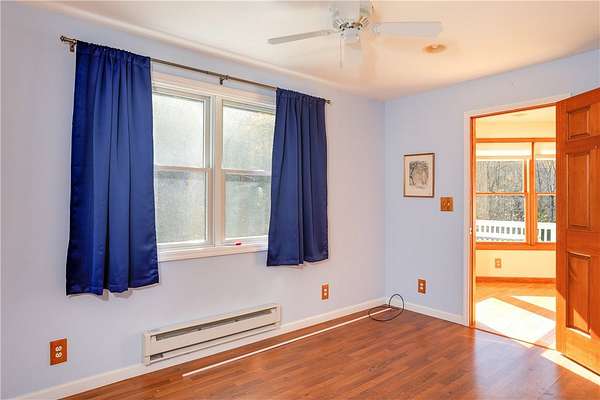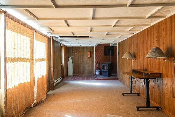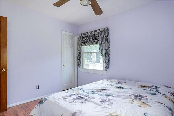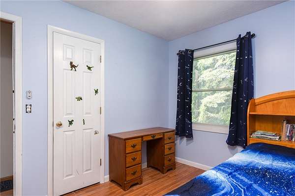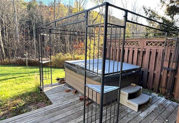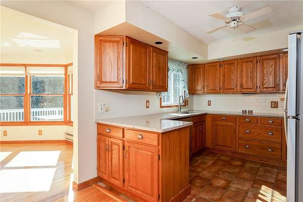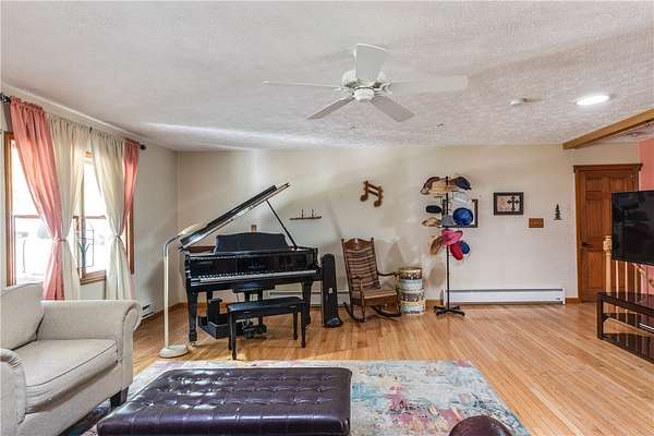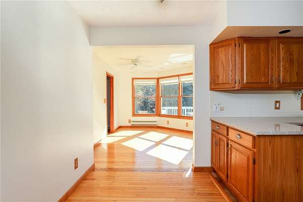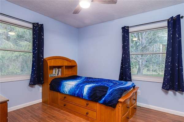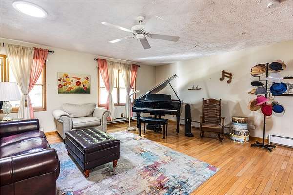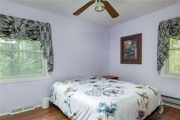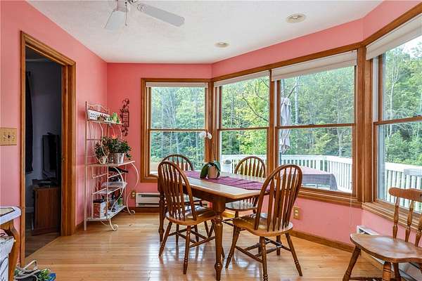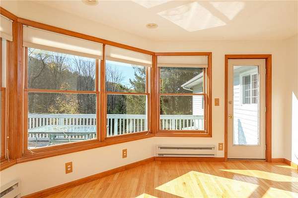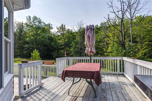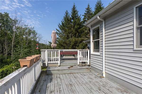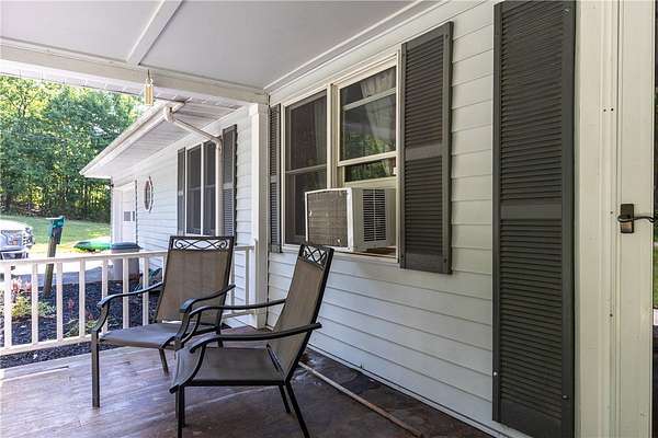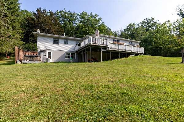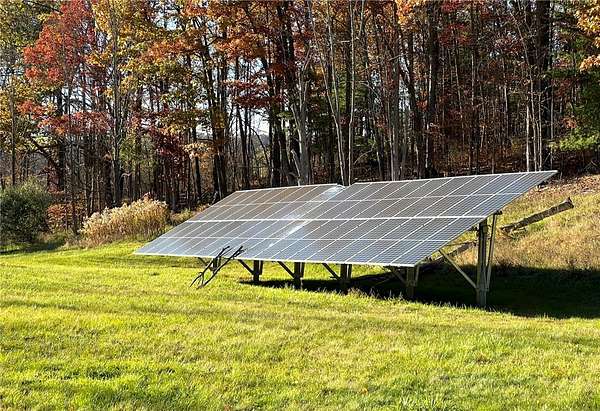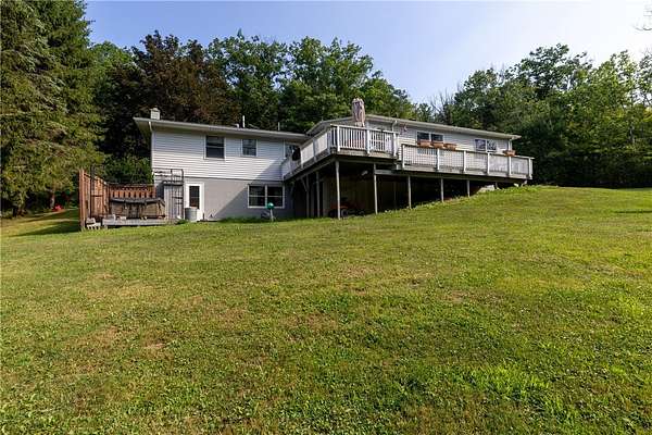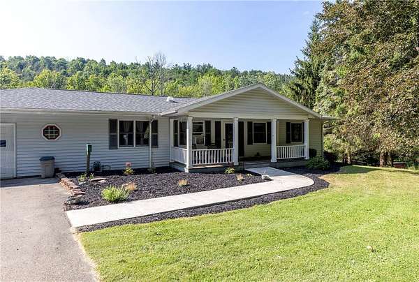 Escape to this rare-find 1972 ranch, perfectly blending country privacy with contemporary, energy-efficient living because it comes with a solar system. This beautiful 4-bedroom, 2-bath home features an attractive split-bedroom floor plan ideal for families: a private master suite is situated on one side, while three additional bedrooms and a full bath occupy the other. You'll love the elegant hardwood floors, bright skylights, and the modern kitchen showcasing sleek granite countertops. The sun-filled dining room offers direct access to the deck, perfect for grilling and entertaining. The attached one-car garage flows to a large mudroom, then to the spacious living room with hardwood floors and skylights. Downstairs, the partially finished walk-out lower level provides a large family room, efficiently heated by a pellet stove, with direct access to the private hot tub. This level also includes a second kitchenette plus a bonus room that could serve as a craft room, home office or fifth bedroom. But the real appeal is the nearly off-grid potential! With solar panels offsetting about 80% of electricity costs over the course of a year (and the whole house is electric), your utility bills will be enviably low. Set on 2.6 rural acres, the expansive backyard is a dream, featuring multiple outbuildings and a treehouse-the perfect setting for a self-sufficient homestead. The property is bordered in the back by a creek.