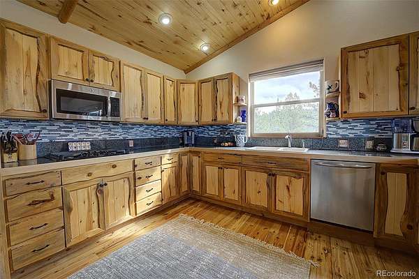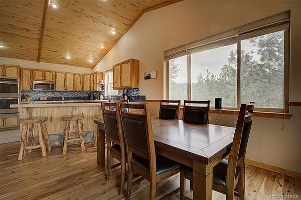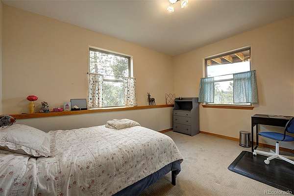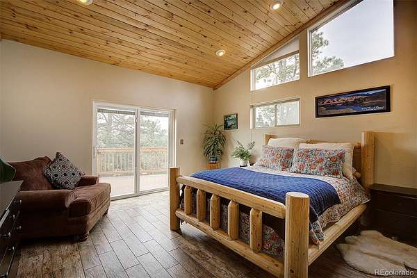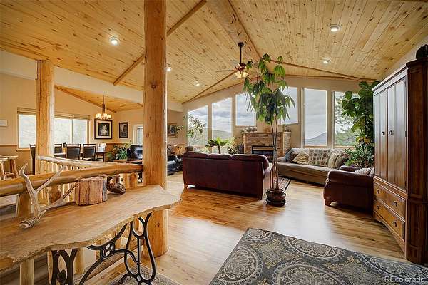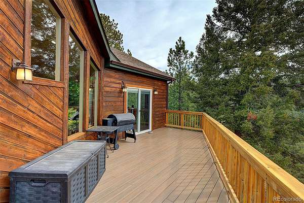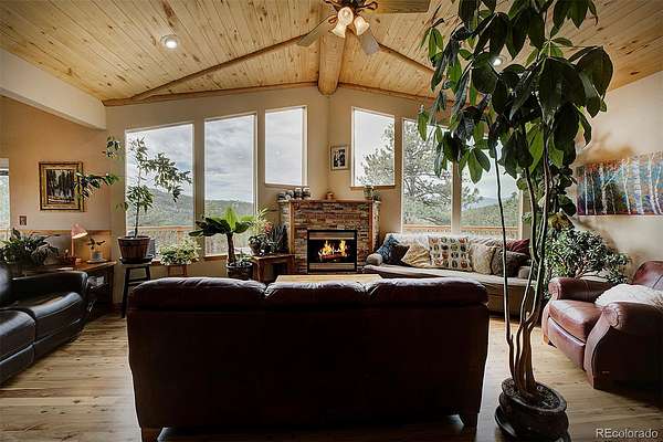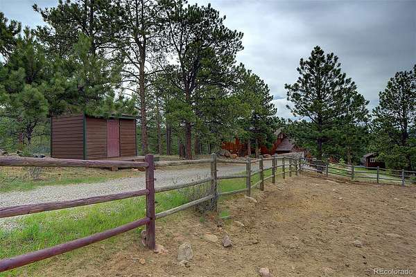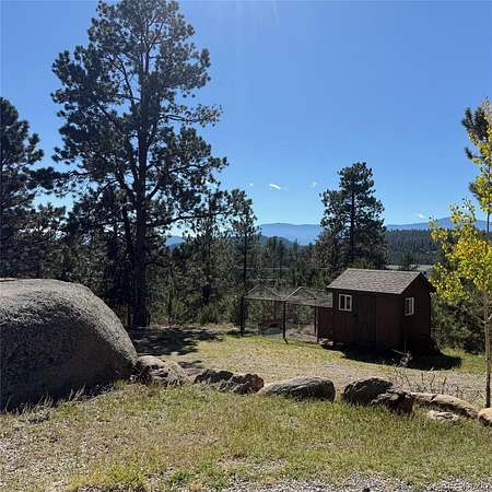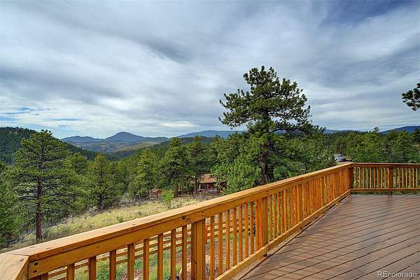 50-MILE SNOWCAP VIEWS from Pikes Peak to Mount Rosalie define this exceptional 5-acre mountain property, offering rare quality and value under $1M. Tucked at the end of a peaceful cul-de-sac, this beautifully maintained builder’s home blends custom touches and warmth with thoughtful modern efficiency. Expansive windows in the great room frame breathtaking vistas, creating a seamless connection between indoors and out. Tile and newly refinished wood floors complement vaulted wood ceilings and custom trim throughout. The kitchen features granite counters, stainless appliances, abundant workspace and stunning custom cabinetry. Designed for comfort and efficiency, the home incorporates passive solar orientation and a new energy-efficient 8-zone boiler providing in-floor radiant heat. In late 2024, all buildings received new roofs, with updated gutters and downspouts on the main home. Outdoor living shines with expansive deck spaces for sun and shade, professionally landscaped native plantings, flagstone pathways, lichen-covered boulders and towering pines. A new 3-rail cedar fence with integrated coated wire secures pets while preserving natural beauty. Equestrian amenities include a barn/run-in shed, large paddock, 60’x100’ outdoor arena and pasture. A charming predator-proof chicken coop offers generous space for free-range birds. Enjoy the best of mountain living with convenient access—30 minutes to the western Denver Metro area, 60 minutes to downtown Denver, 70 minutes to DIA and 90 minutes to world-class skiing.