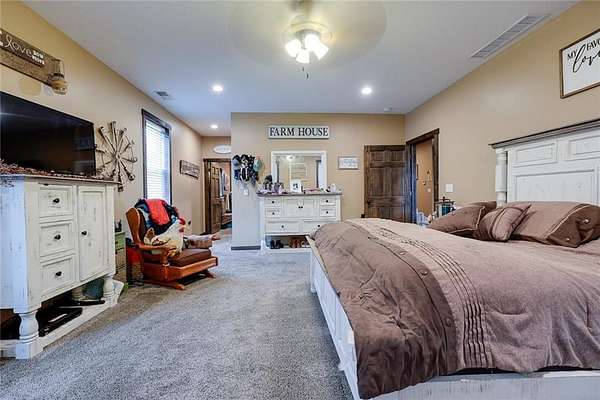 Enjoy tranquil mornings and unforgettable sunsets from the oversized wraparound porch, watching deer graze, hawks soar, and family memories unfold. The long, private driveway leads to a spacious 1500 sq ft garage with two doors and room for 4 to 6 vehicles, plus a certified in-slab tornado/storm shelter for peace of mind.