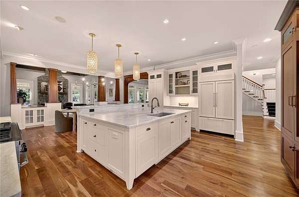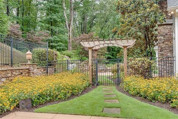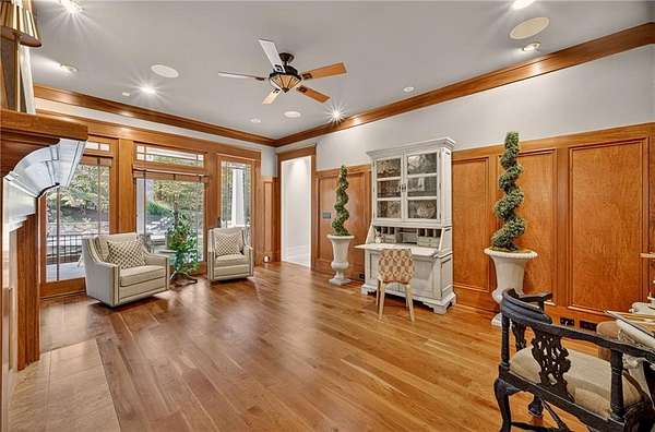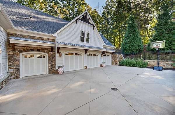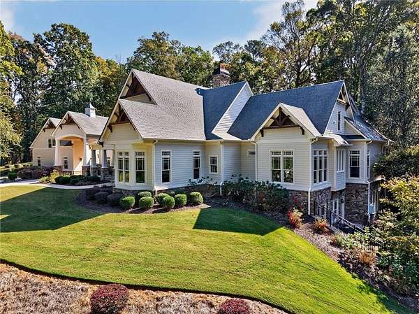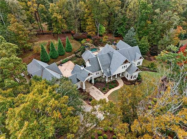 Discover timeless elegance and resort-style living in this extraordinary Craftsman estate nestled within the gated community of Trinity Creek in Canton. Perfectly positioned on three private acres with breathtaking views of the North Georgia mountains, this home offers the perfect blend of luxury, tranquility, and masterful design. A private gated entrance and wide circular driveway welcome you to an architectural masterpiece featuring soaring ceilings, rich American cherry hardwood floors and doors, detailed millwork, and exceptional craftsmanship throughout. Recently refreshed, the exterior now boasts a stunning new look with all-new paint, stain, and seal, elevating its curb appeal and timeless presence. The chef's kitchen has been completely updated with Signature Hardware fixtures, a granite sink, brass hardware, honed Taj Mahal quartzite countertops with backsplash shelf detail, and a custom Sub-Zero refrigerator with wood panel design. This elegant culinary space flows effortlessly into the fireside great room and dining area-perfect for entertaining or relaxing evenings at home. The main level offers both a serene owner's suite with a spa-inspired bath, steam shower, yoga room, and screened porch overlooking the gardens and pool, as well as a secondary junior master suite ideal for guests or multigenerational living. The home is elevator ready with elevator wiring and a dedicated shaft, providing convenience and future accessibility Upstairs, spacious bedrooms feature en-suite baths and a glass-enclosed loft ideal for work or play. Step outside to your own private oasis with a saltwater wading pool spa and waterfall, surrounded by manicured gardens and peaceful mountain views. Completing this exceptional property is a charming carriage house with a full apartment, offering flexibility for older children, guests, or live-in help, and an additional private deck, and hot tub.